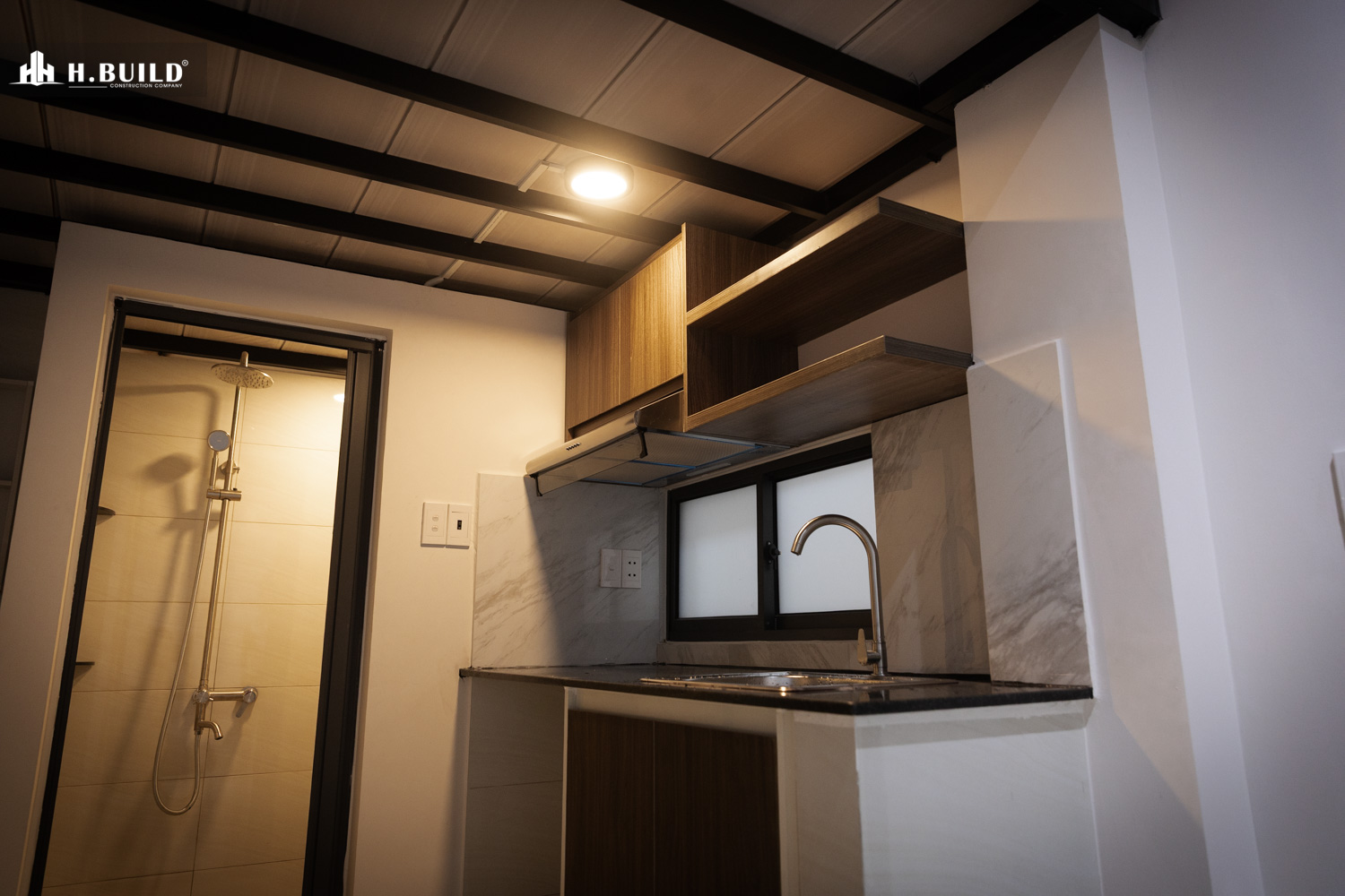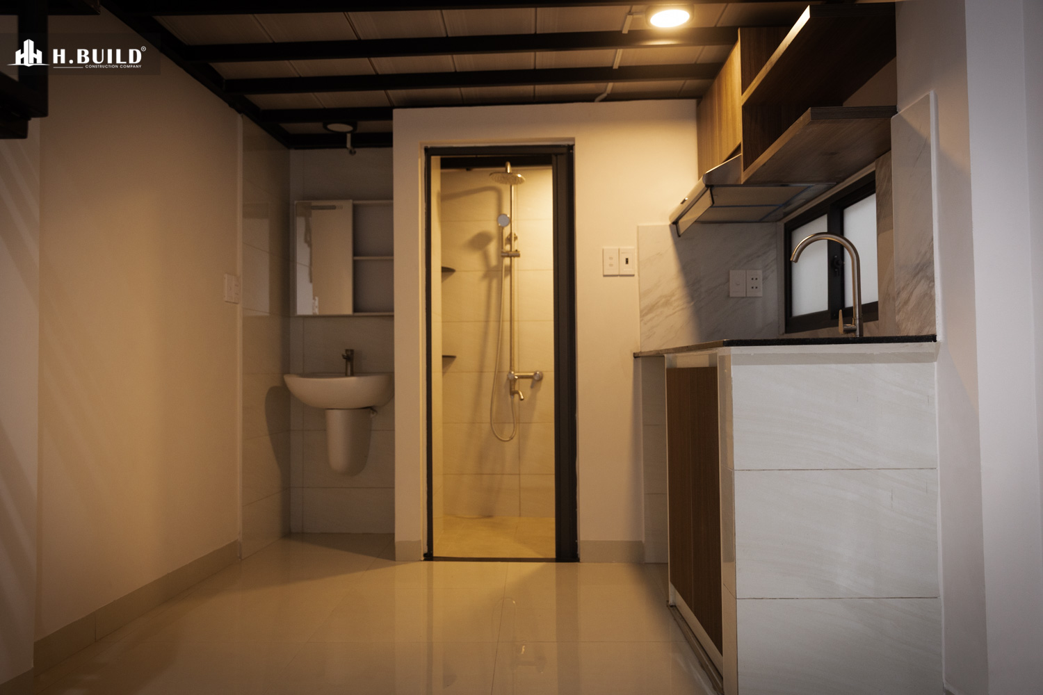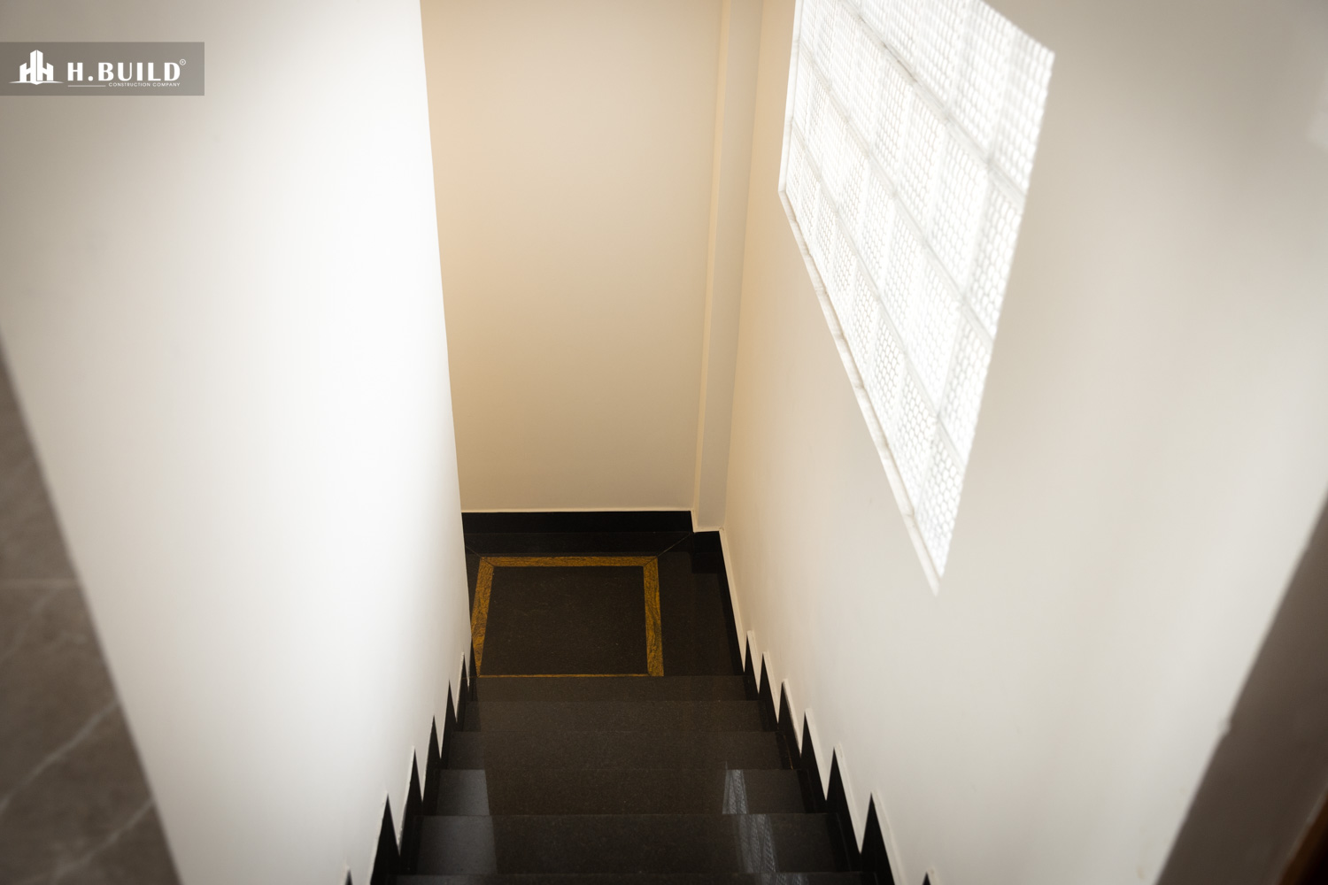 Tầng trệt được ốp đá Marble toàn diện – một giải pháp đắt giá giúp công trình luôn sạch sẽ, bề thế và khắc phục nhược điểm dễ bám bẩn của nhà hẻm.