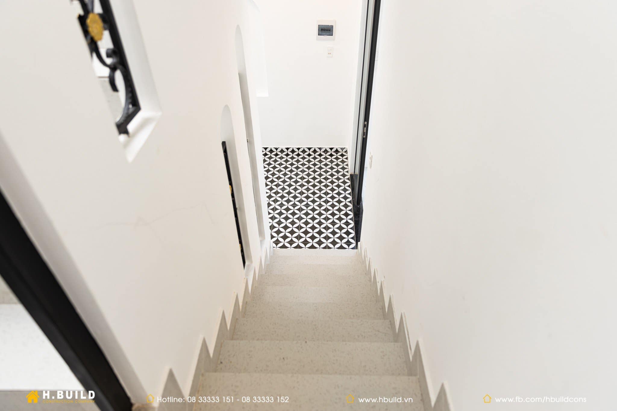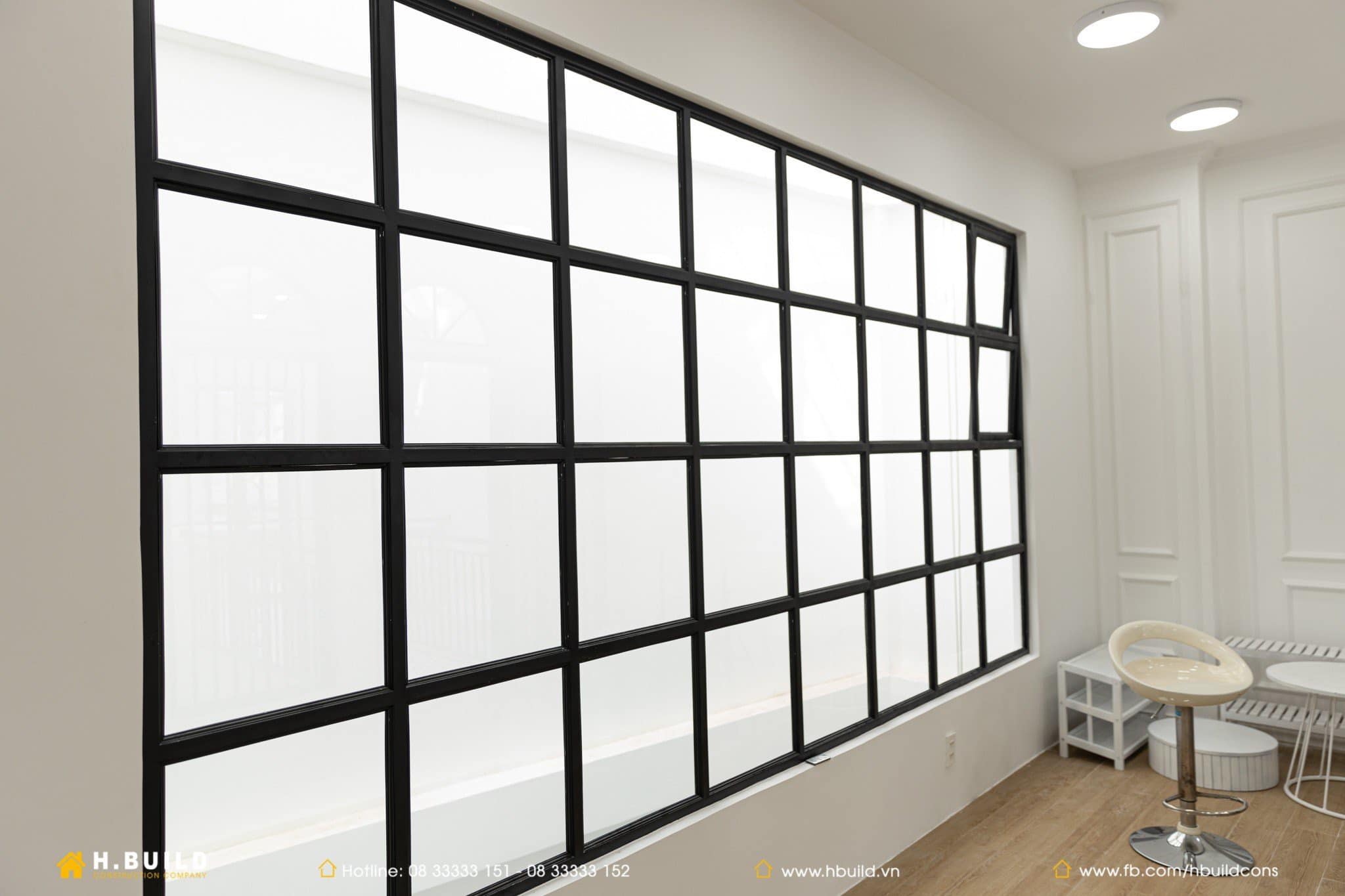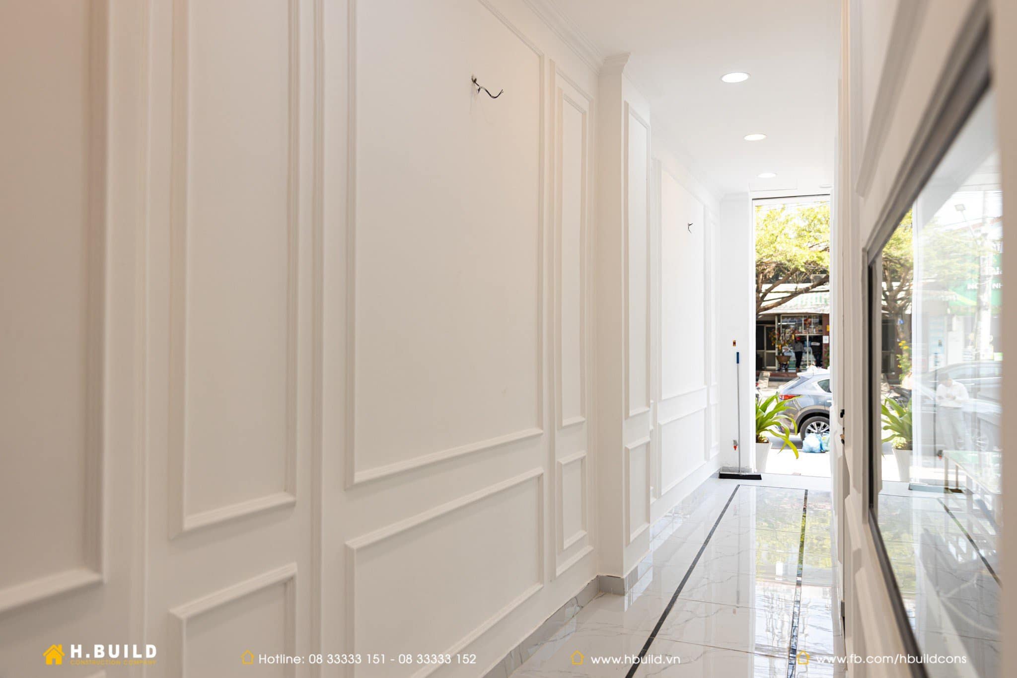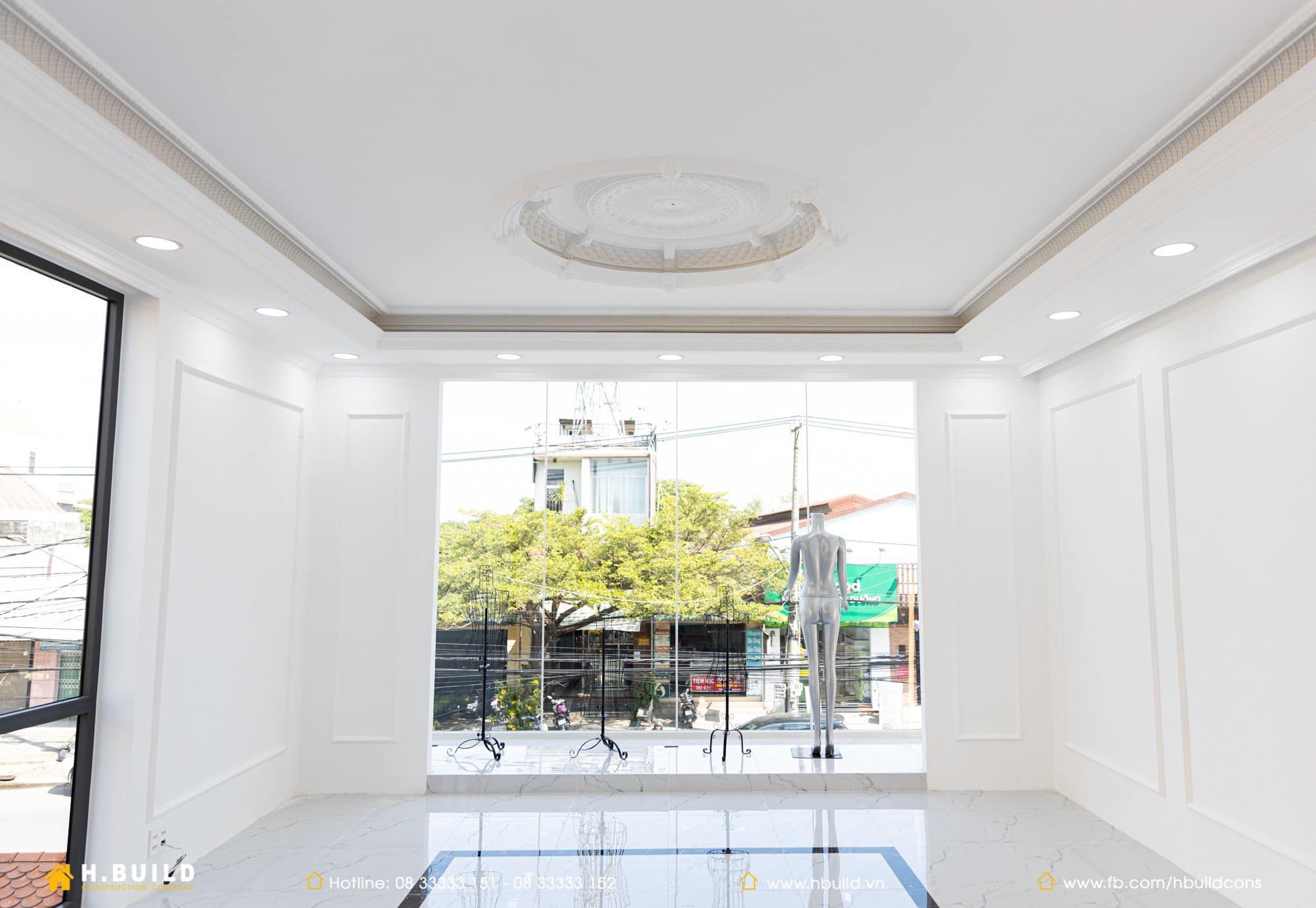 Thay vì những chi tiết trang trí rườm rà, Kiến trúc sư H.Build sử dụng hệ vòm kính lớn (Big Arch) thông tầng để mở toang không gian, kết hợp cùng ánh sáng vàng ấm áp, biến mặt tiền thành một “sân khấu” lộng lẫy tôn vinh những chiếc váy cưới bên trong.