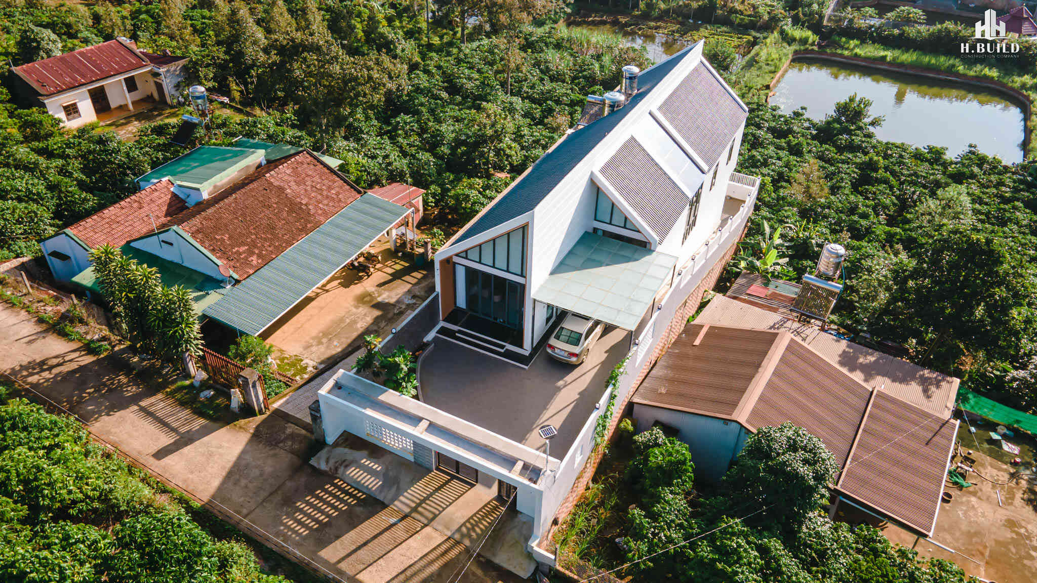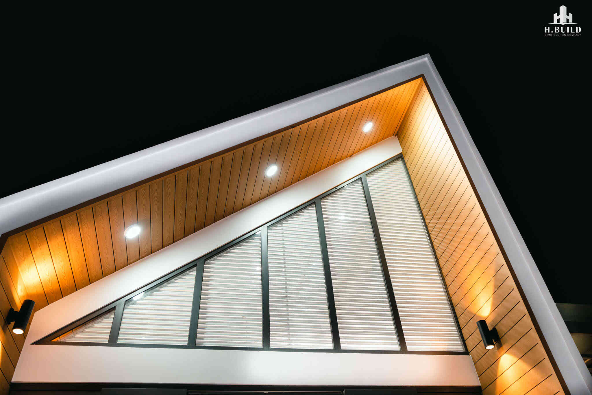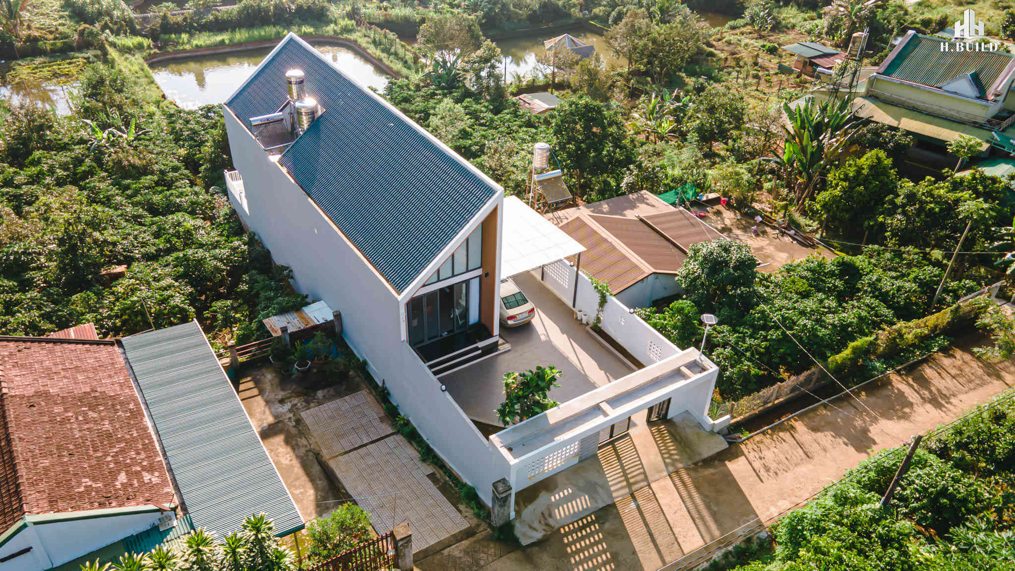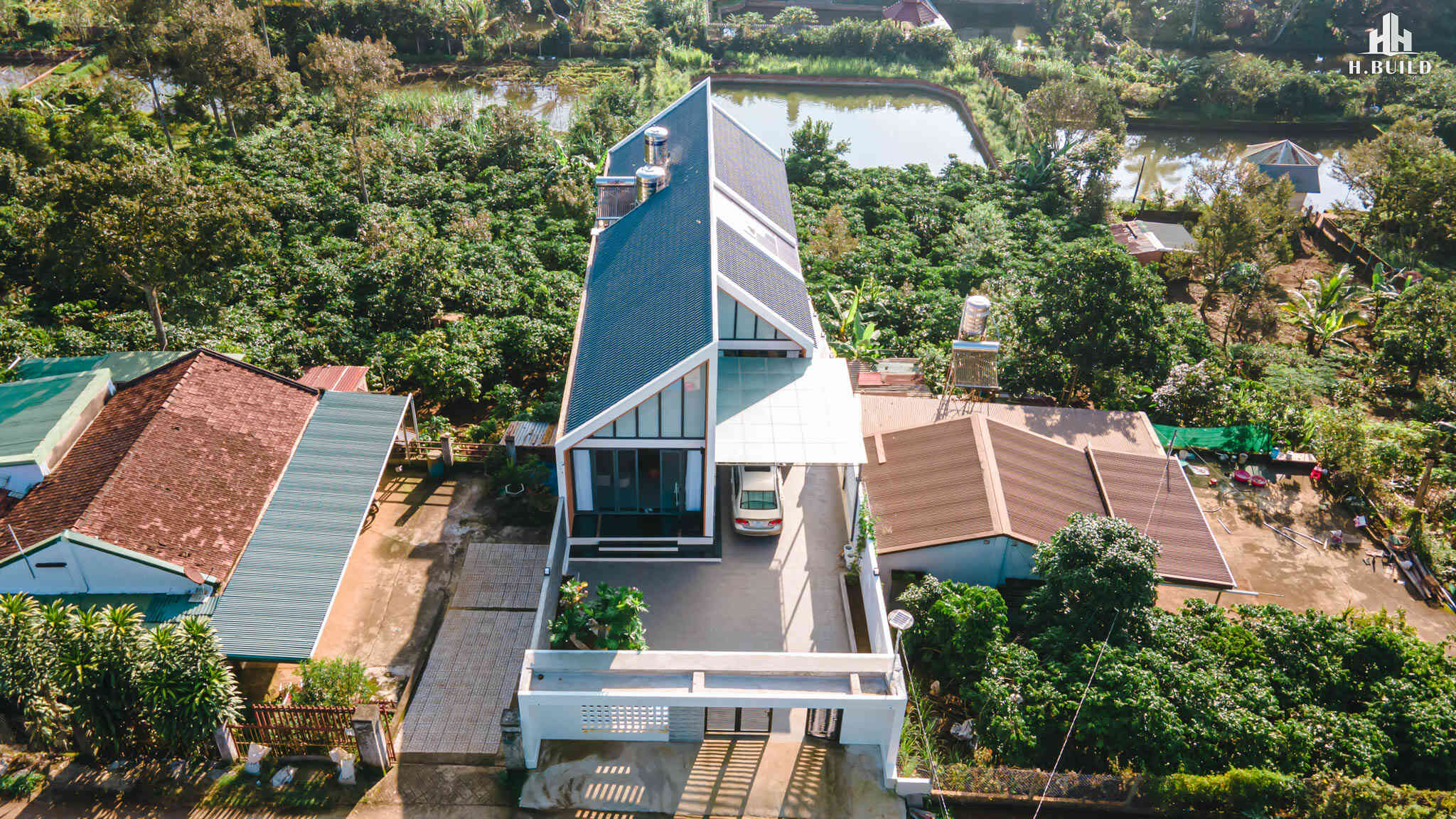 Thích ứng tuyệt đối với những cơn mưa phố núi, công trình sở hữu hệ mái dốc lệch vút cao mạnh mẽ, kết hợp khe lấy sáng để đưa hơi ấm mặt trời vào sâu bên trong. Sự tương phản giữa tường trắng tinh khôi và trần ốp gỗ tạo nên một lớp vỏ cân bằng: vừa hiện đại, vừa đủ ấm áp để chống lại cái lạnh se sắt bên ngoài.