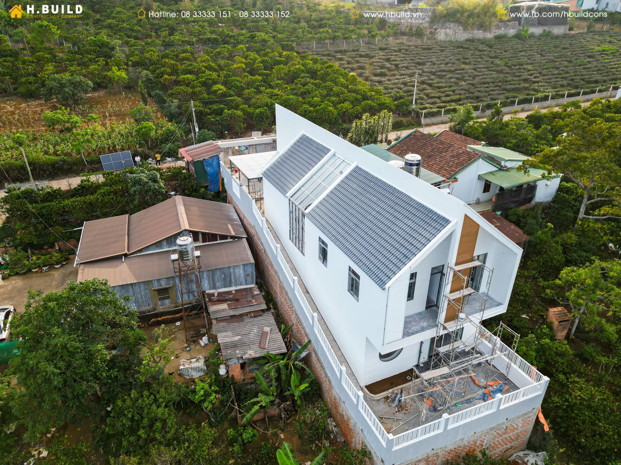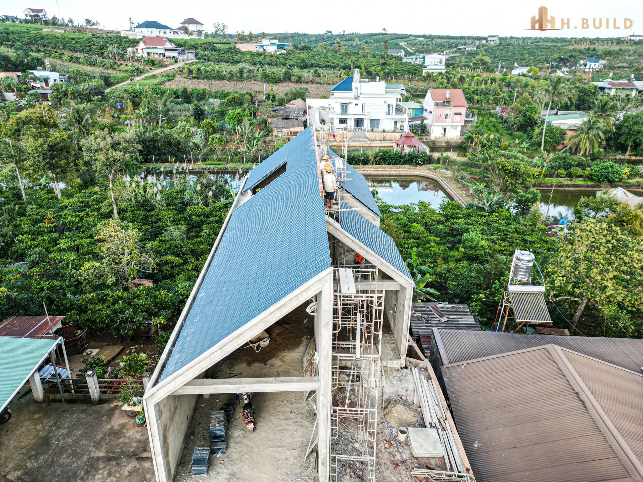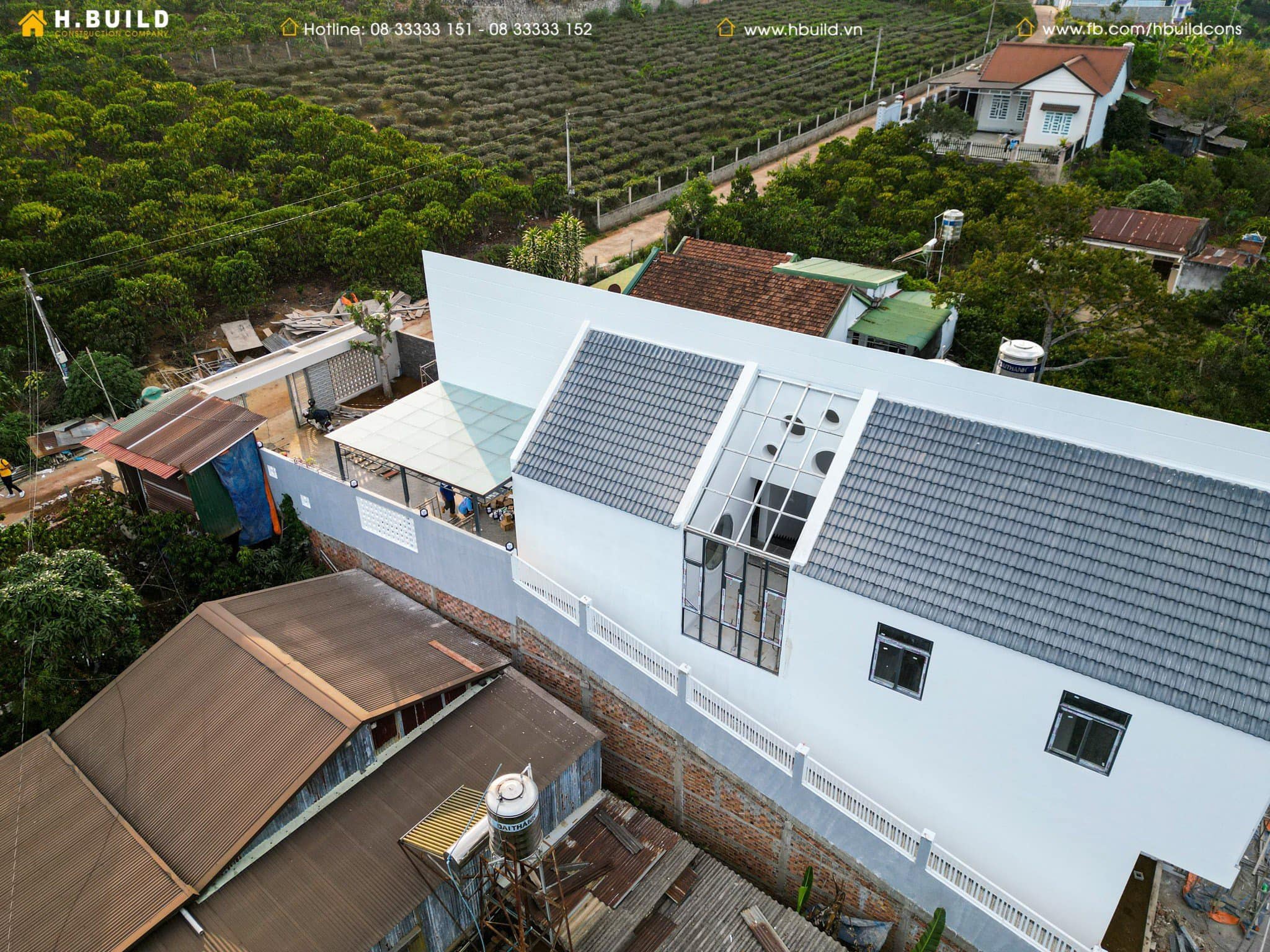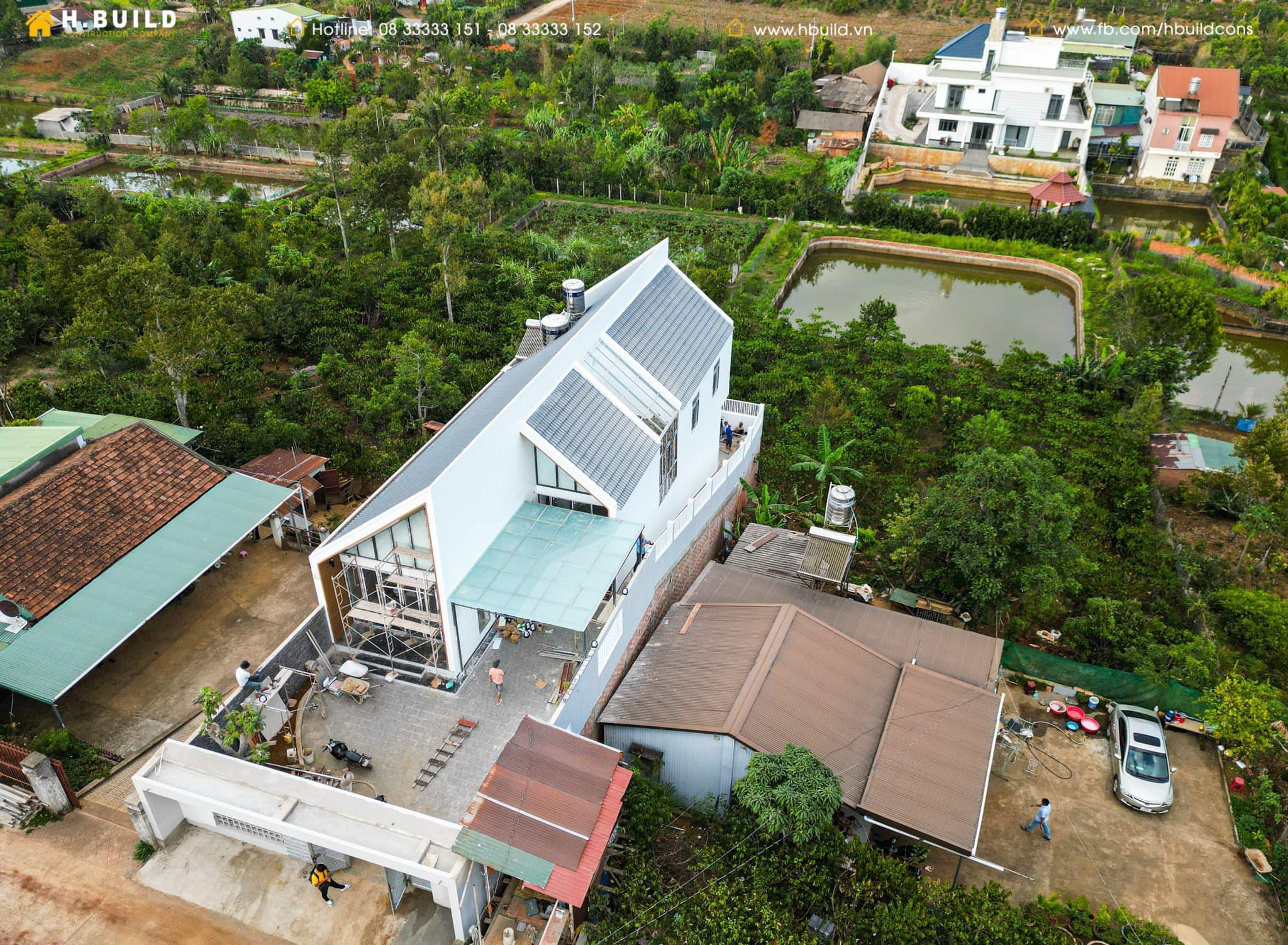 Thích ứng tuyệt đối với những cơn mưa phố núi, công trình sở hữu hệ mái dốc lệch vút cao mạnh mẽ, kết hợp khe lấy sáng để đưa hơi ấm mặt trời vào sâu bên trong. Sự tương phản giữa tường trắng tinh khôi và trần ốp gỗ tạo nên một lớp vỏ cân bằng: vừa hiện đại, vừa đủ ấm áp để chống lại cái lạnh se sắt bên ngoài.