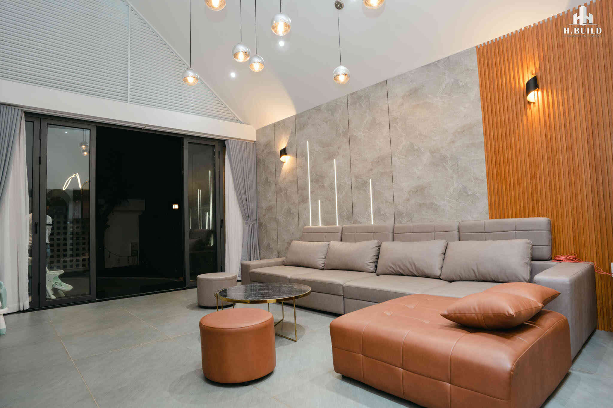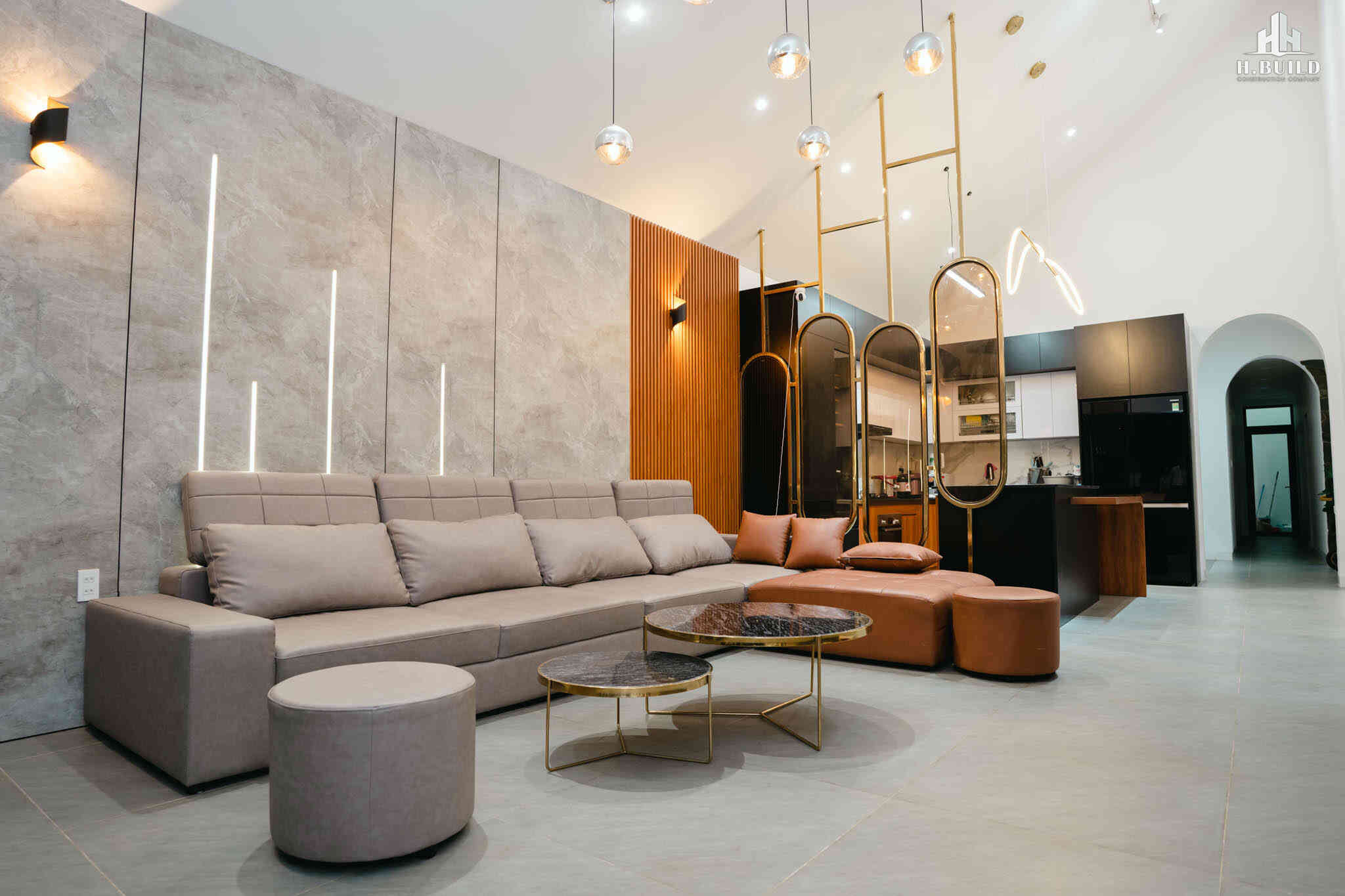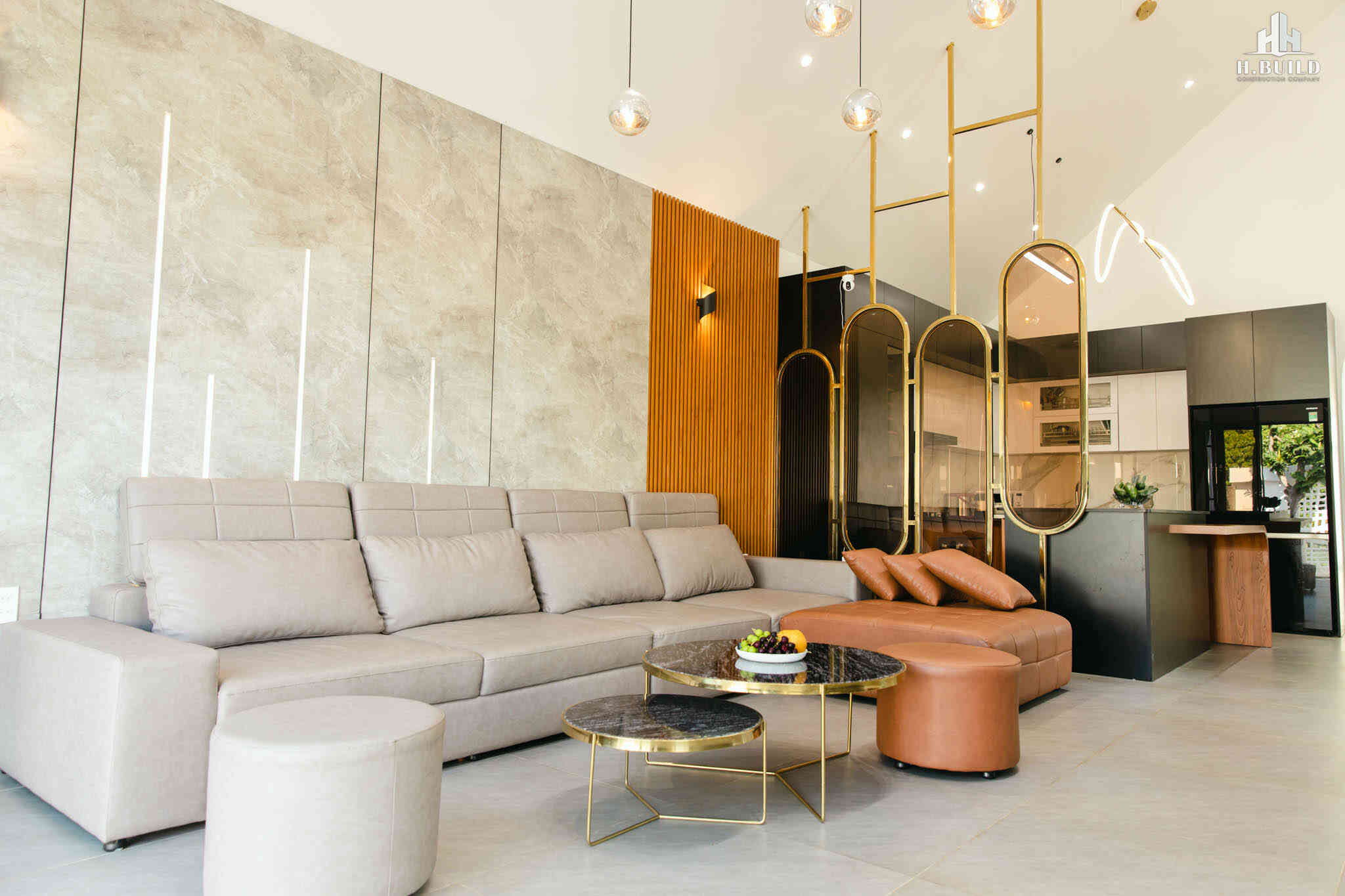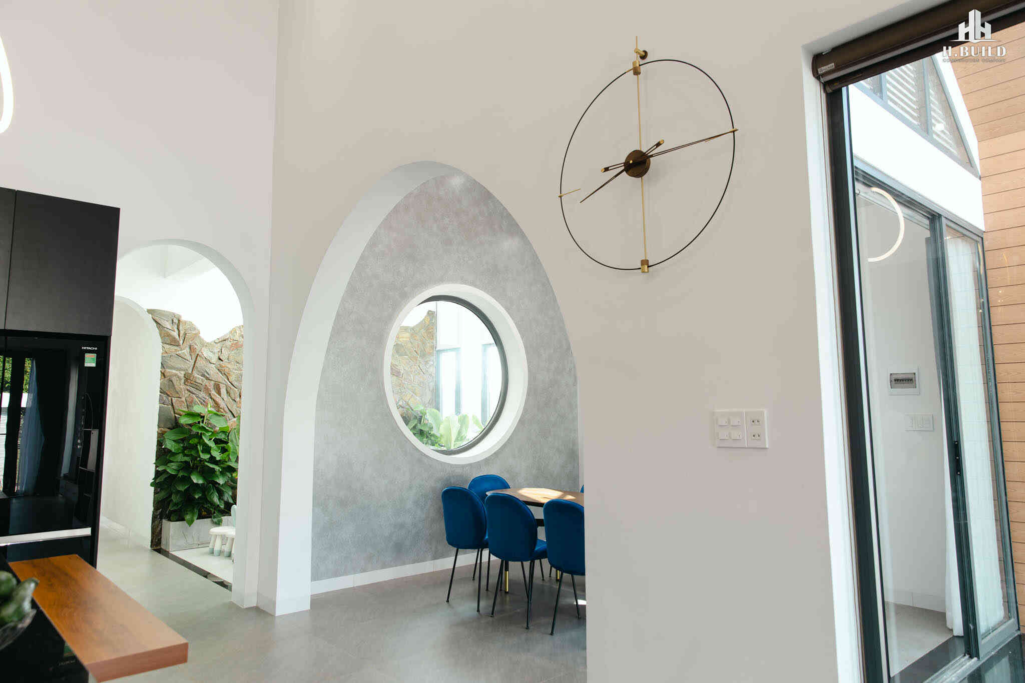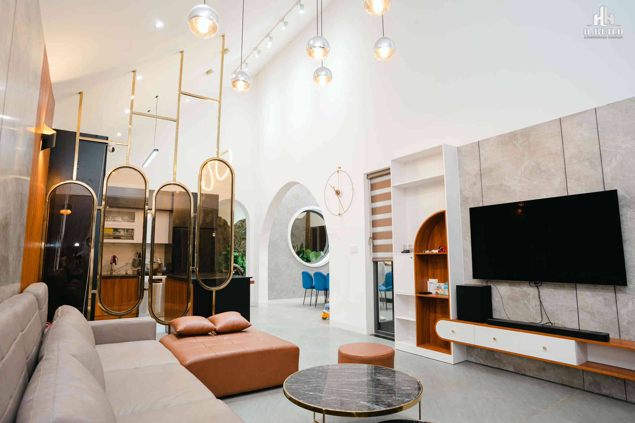 Bên trong là một không gian “Home Resort” đúng nghĩa. Trần thông tầng cao vút, mảng tường hiệu ứng bê tông viền vàng kim loại và những vòm cong mềm mại tạo nên vẻ đẹp sang trọng nhưng đầy phóng khoáng.