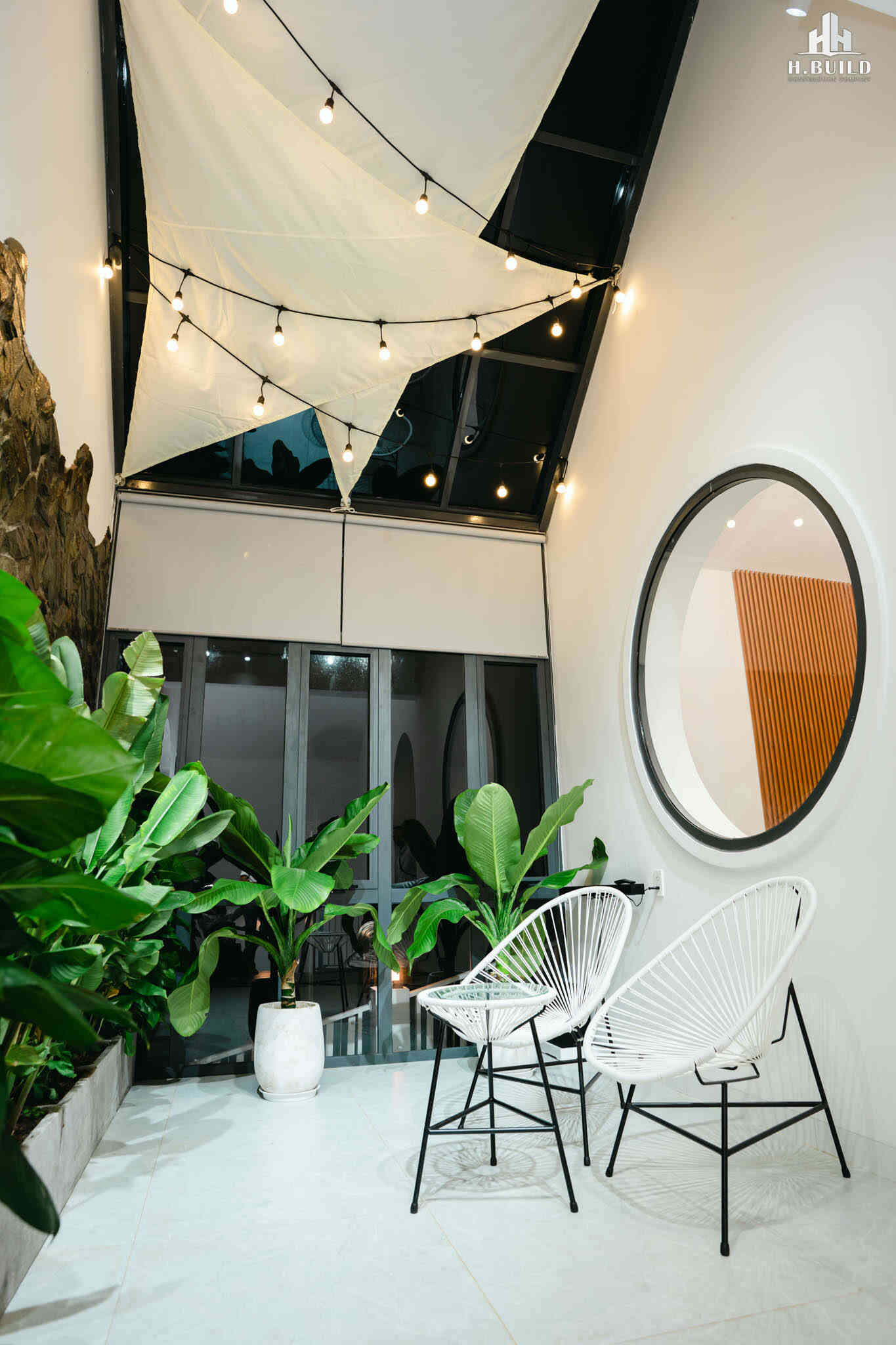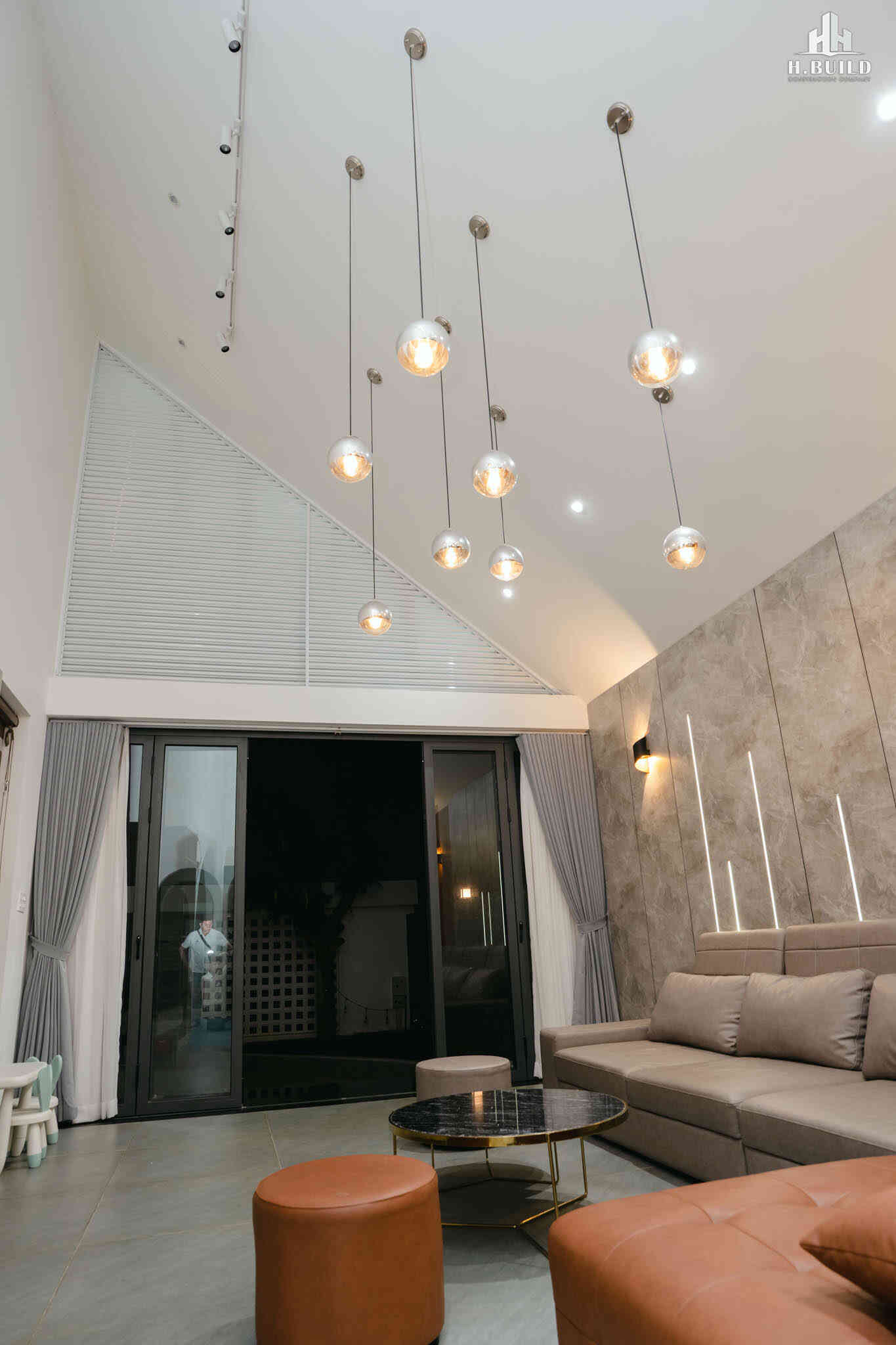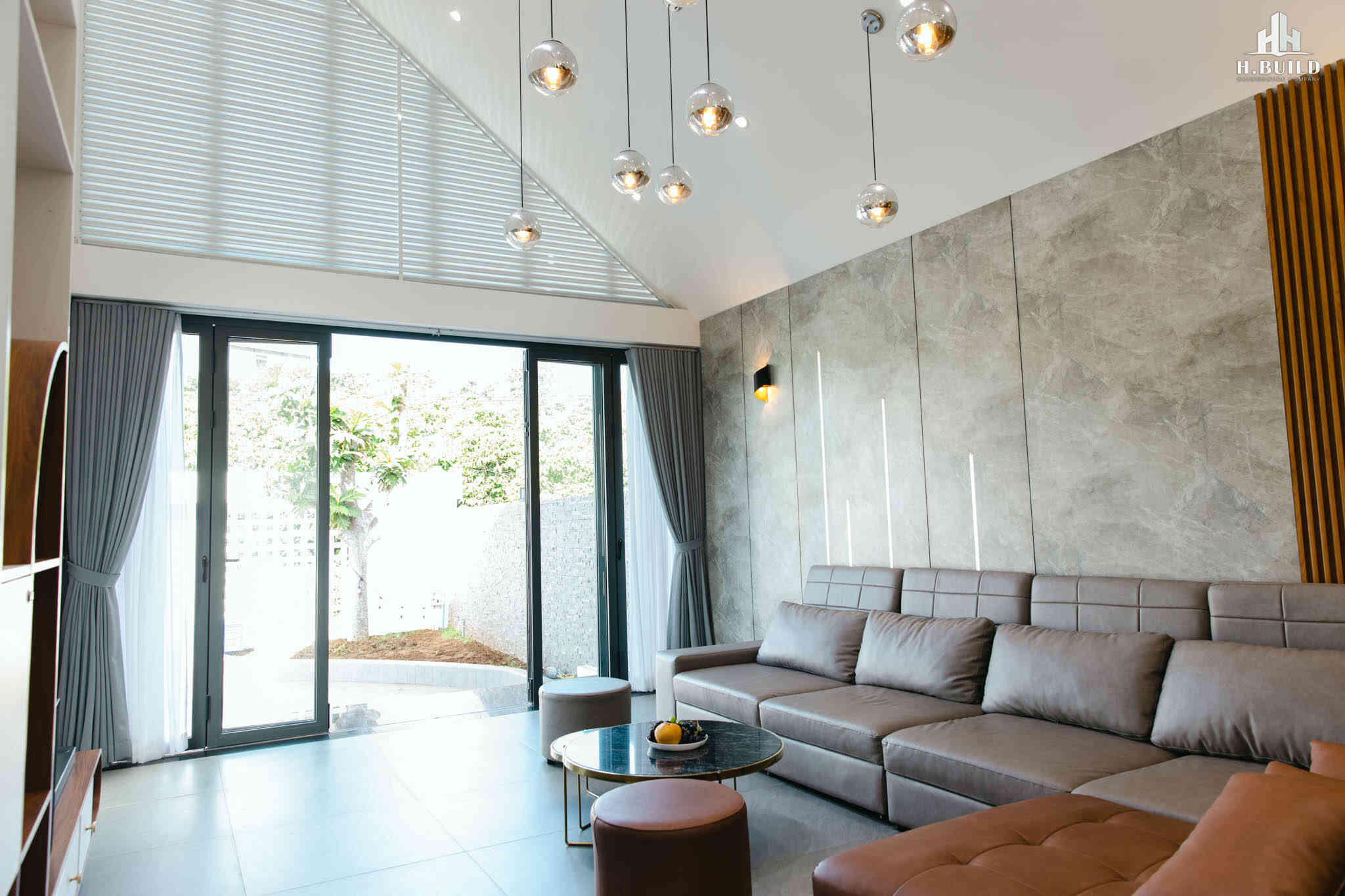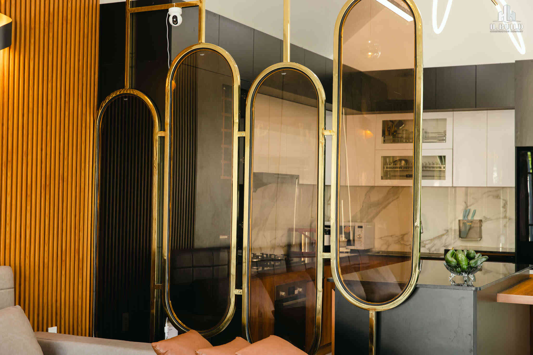 Bên trong là một không gian “Home Resort” đúng nghĩa. Trần thông tầng cao vút, mảng tường hiệu ứng bê tông viền vàng kim loại và những vòm cong mềm mại tạo nên vẻ đẹp sang trọng nhưng đầy phóng khoáng.