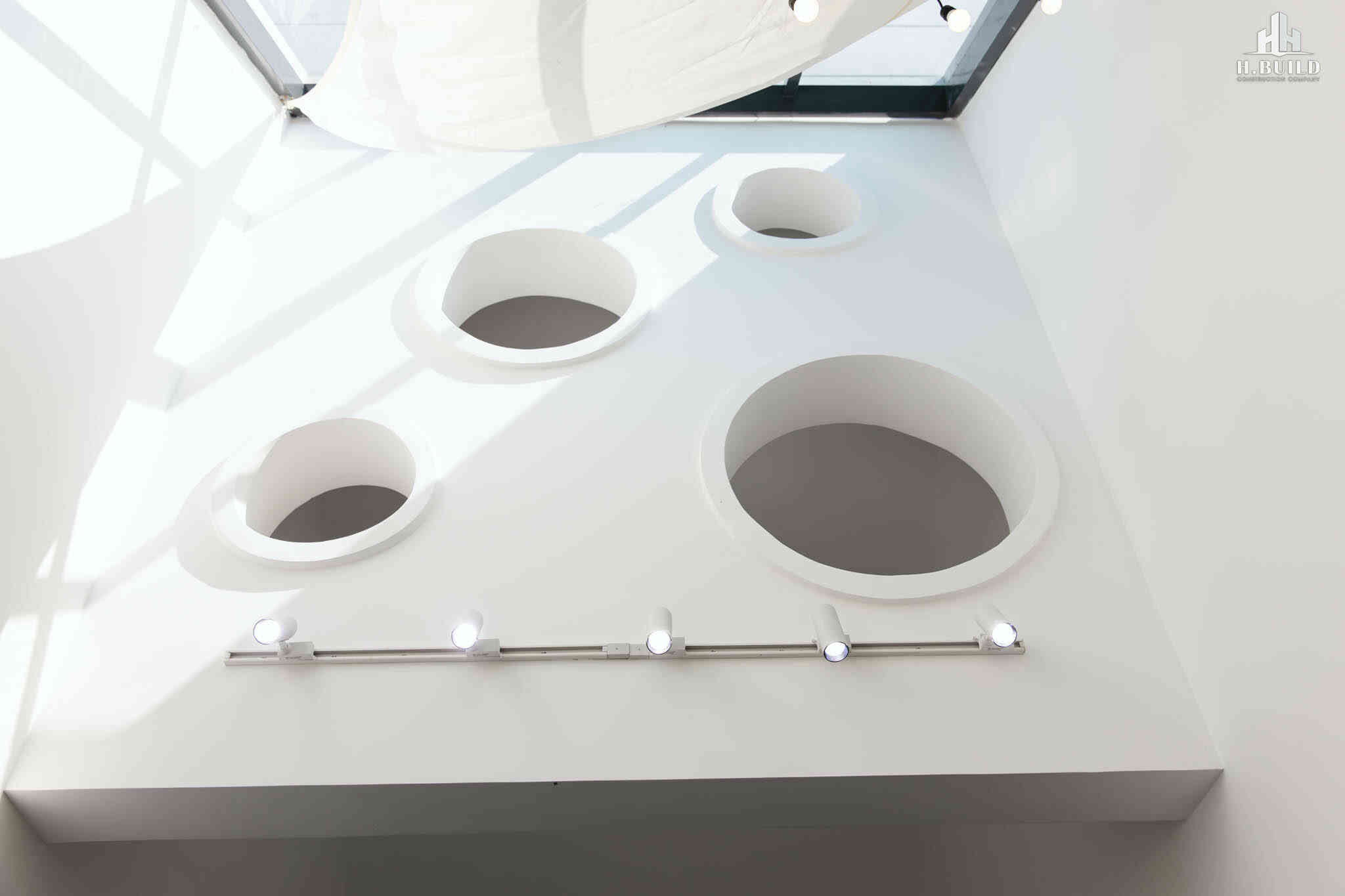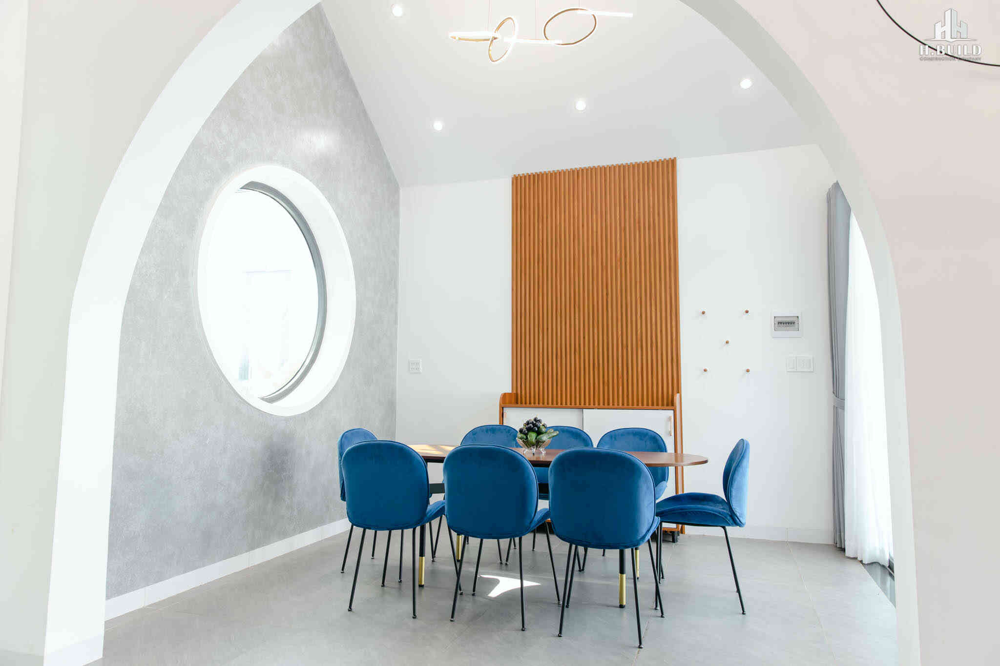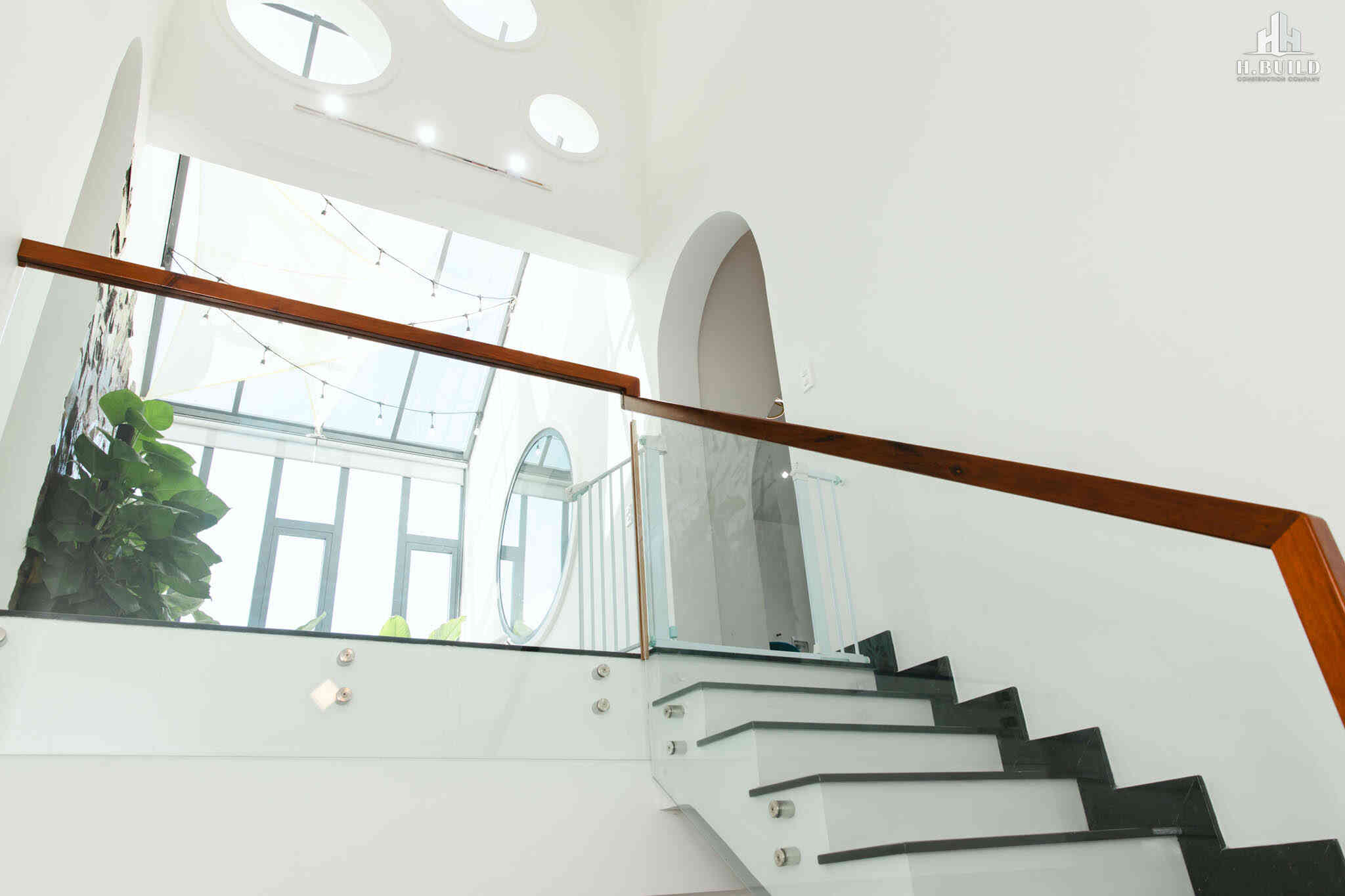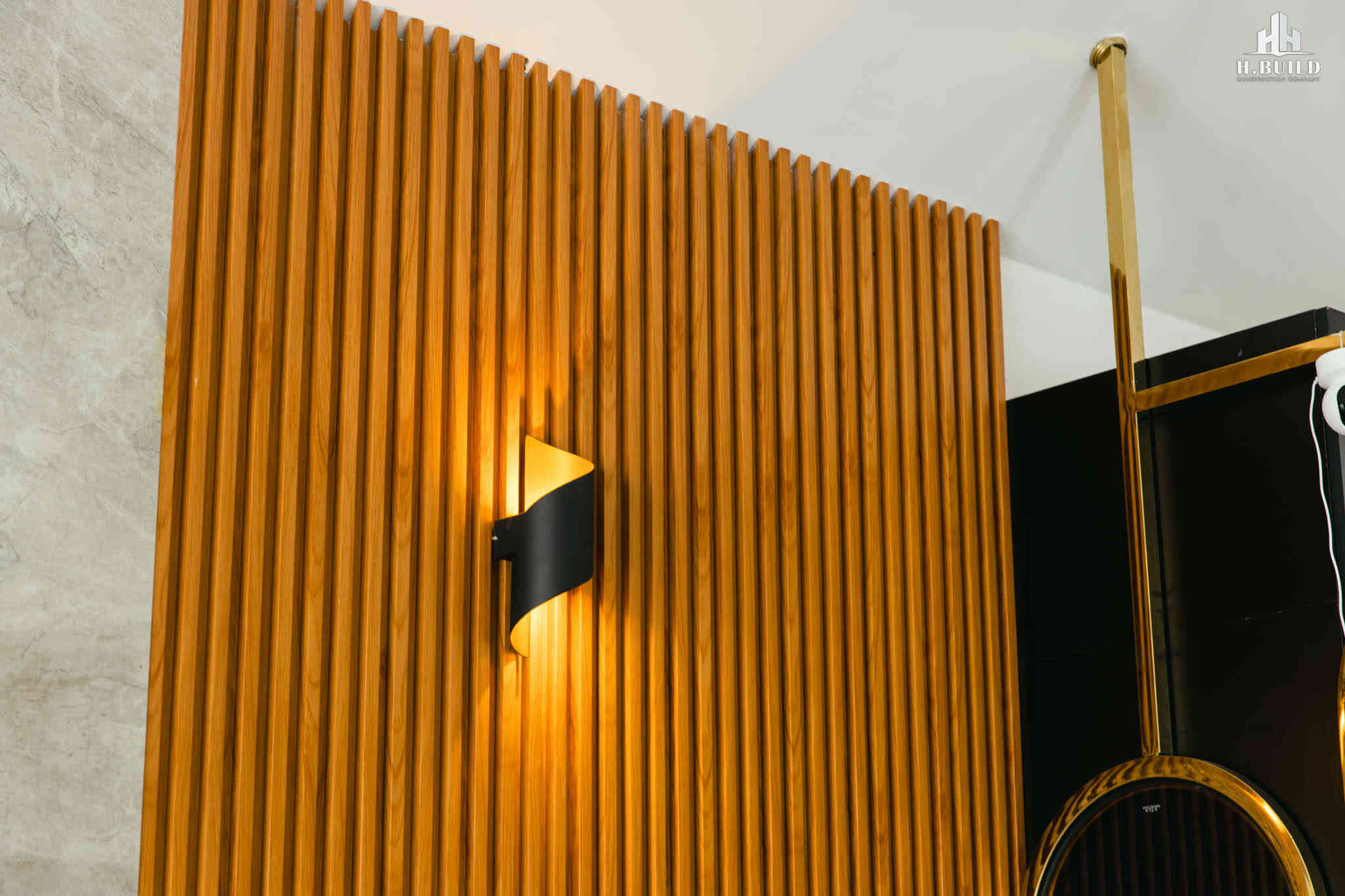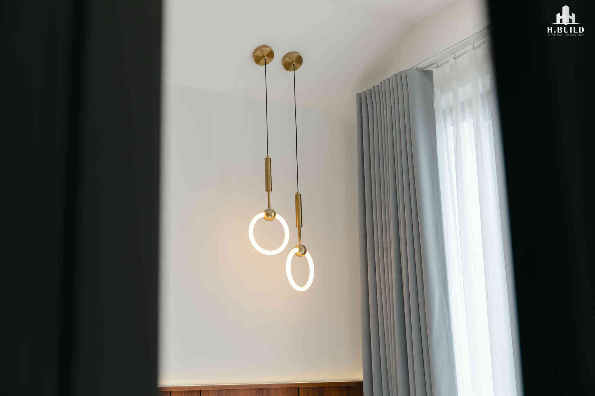Bên trong là một không gian “Home Resort” đúng nghĩa. Trần thông tầng cao vút, mảng tường hiệu ứng bê tông viền vàng kim loại và những vòm cong mềm mại tạo nên vẻ đẹp sang trọng nhưng đầy phóng khoáng.