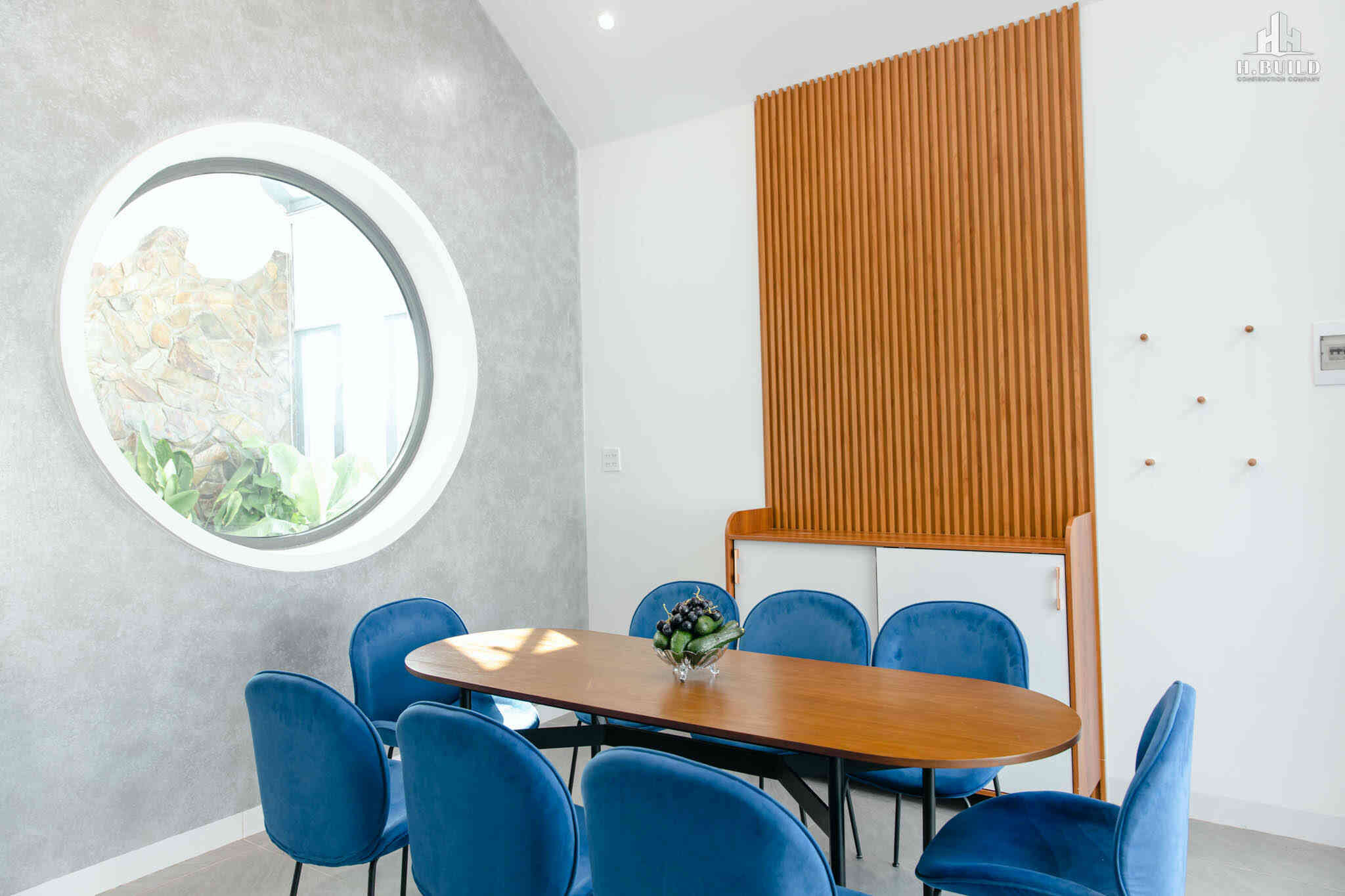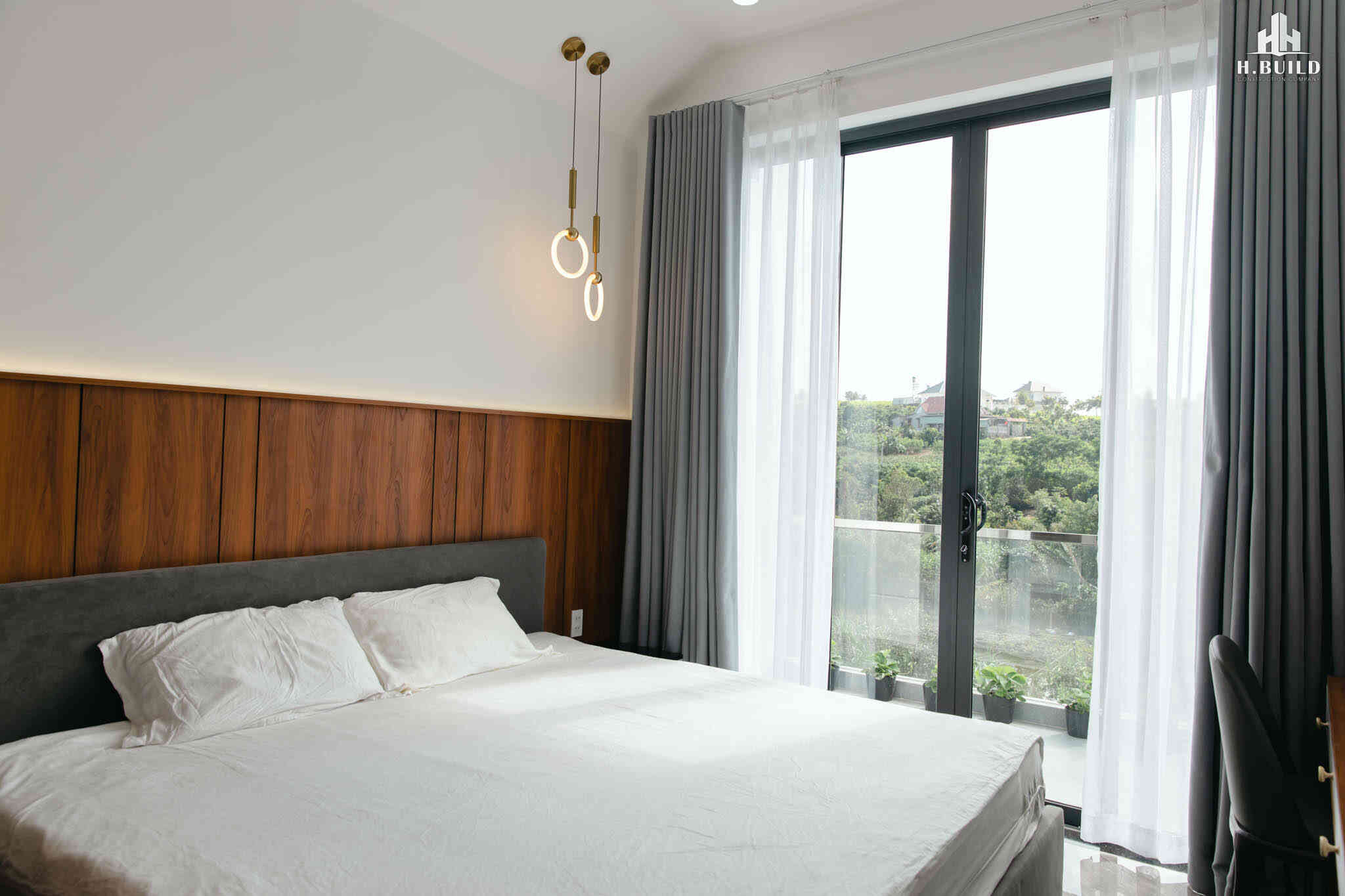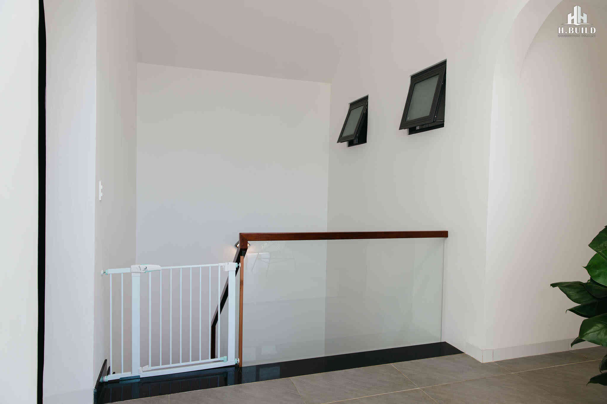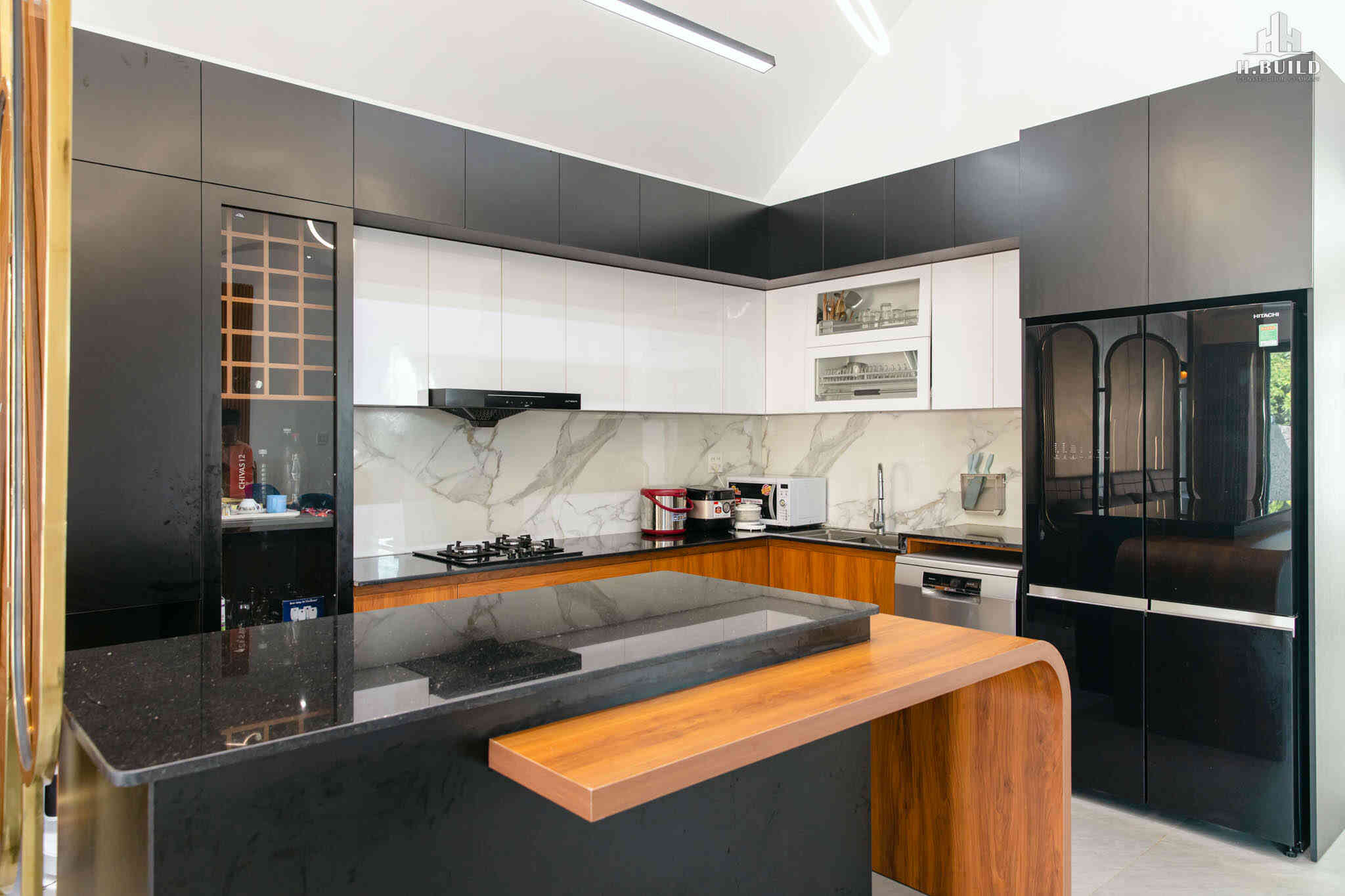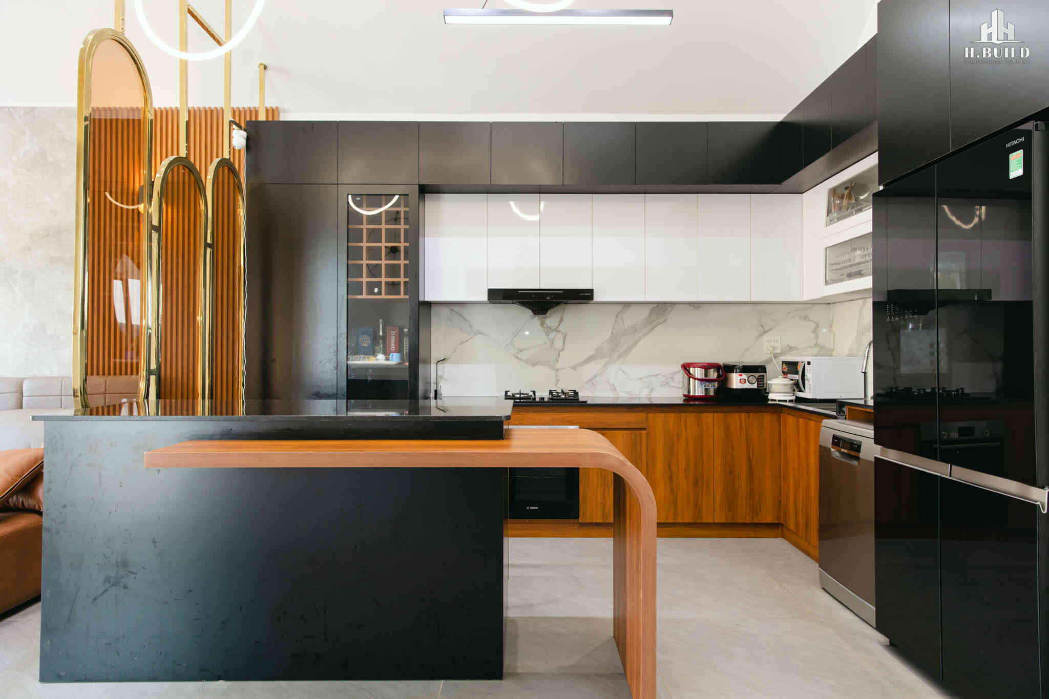 Bên trong là một không gian “Home Resort” đúng nghĩa. Trần thông tầng cao vút, mảng tường hiệu ứng bê tông viền vàng kim loại và những vòm cong mềm mại tạo nên vẻ đẹp sang trọng nhưng đầy phóng khoáng.