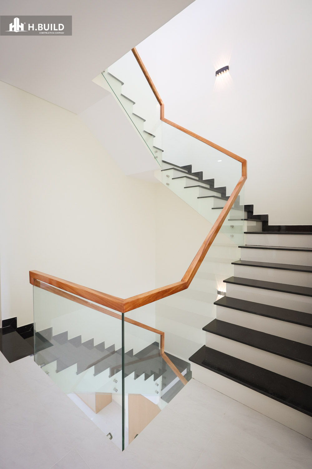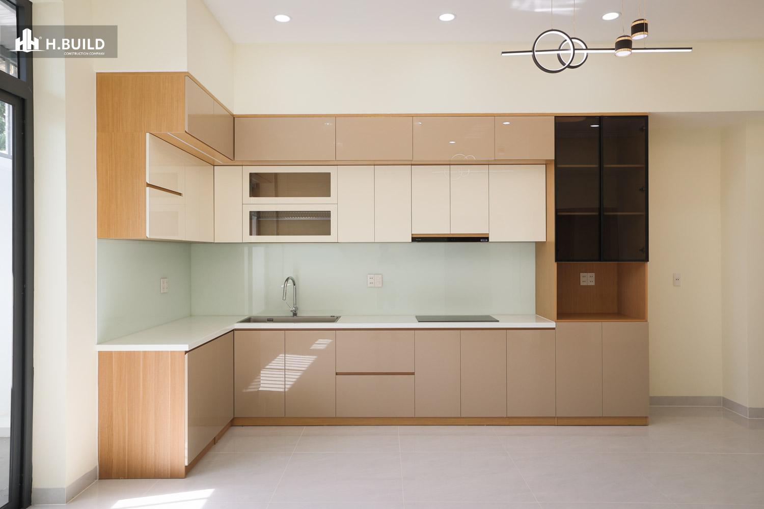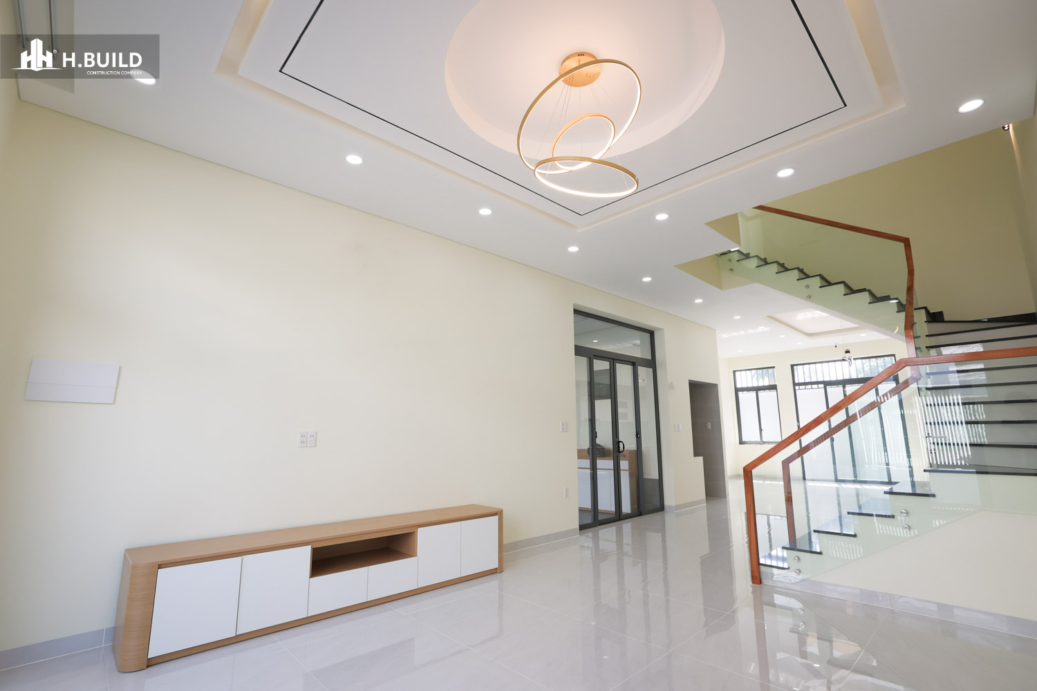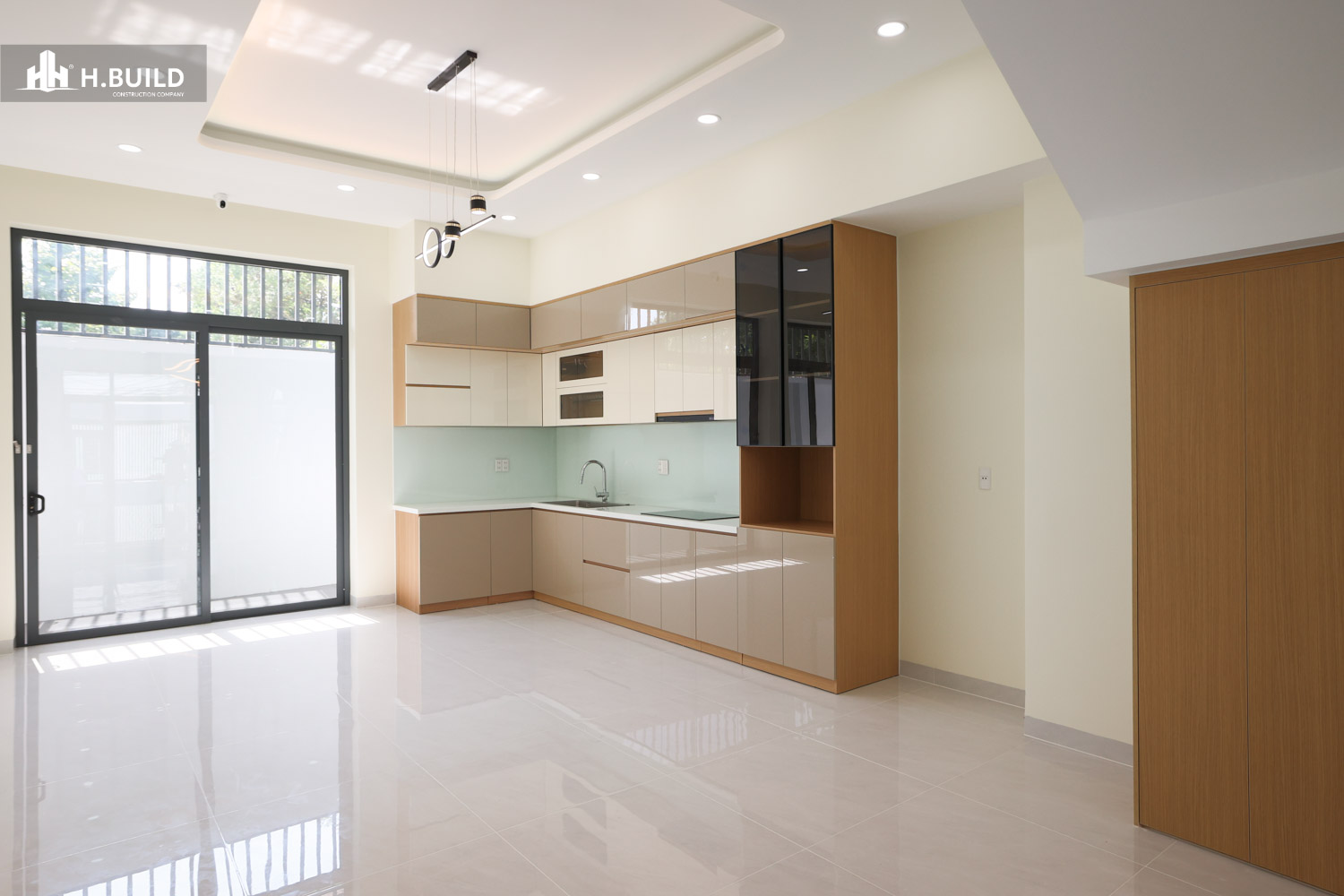 Các vật liệu như đá ốp tự nhiên, kính và kim loại được kết hợp trên nền màu trung tính, tạo nên một vẻ đẹp sang trọng, bền vững với thời gian.