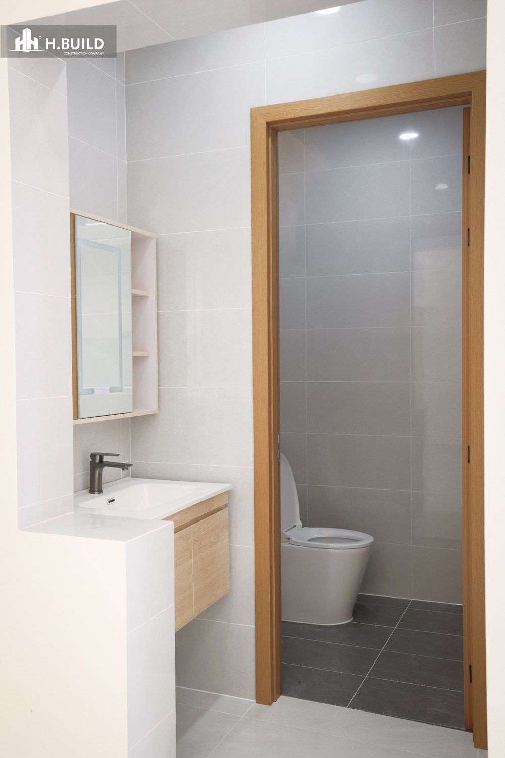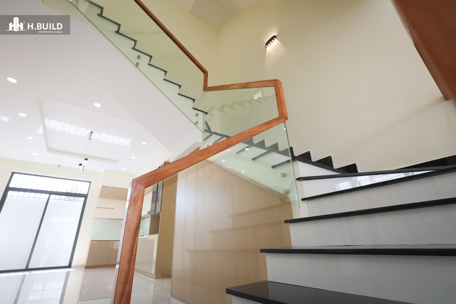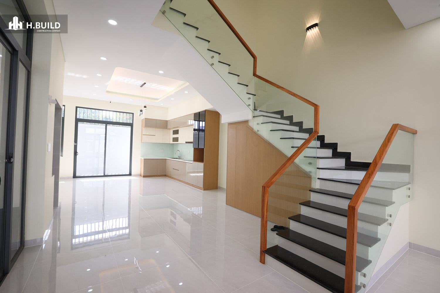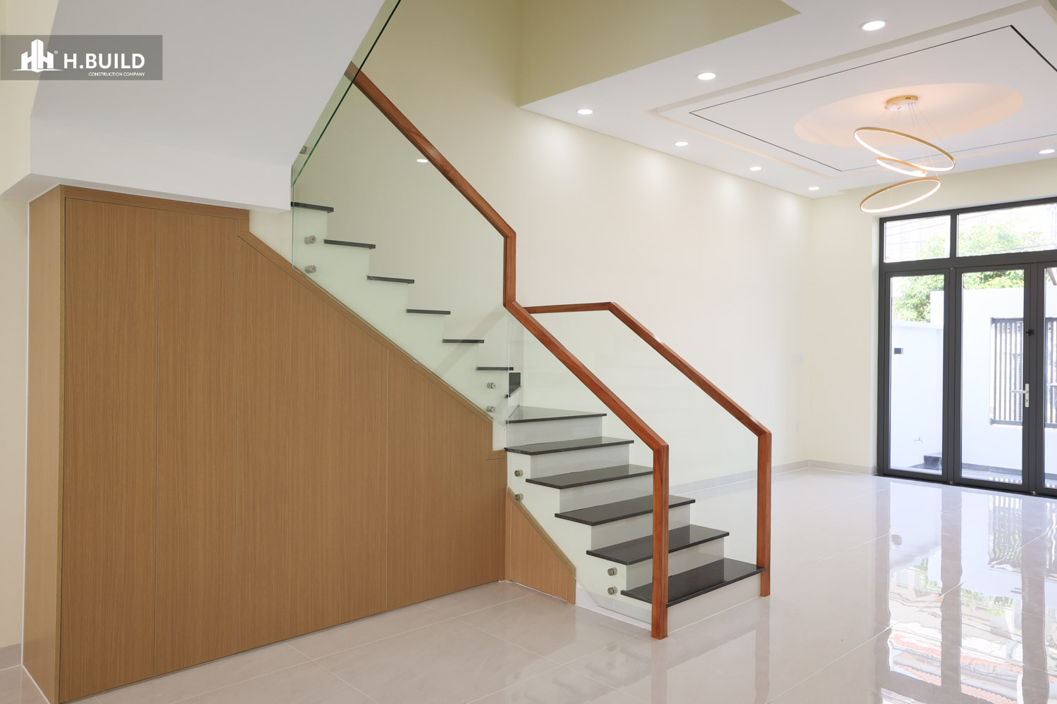 Các vật liệu như đá ốp tự nhiên, kính và kim loại được kết hợp trên nền màu trung tính, tạo nên một vẻ đẹp sang trọng, bền vững với thời gian.