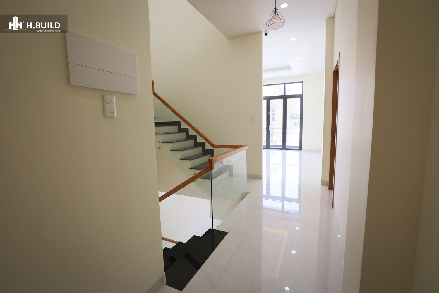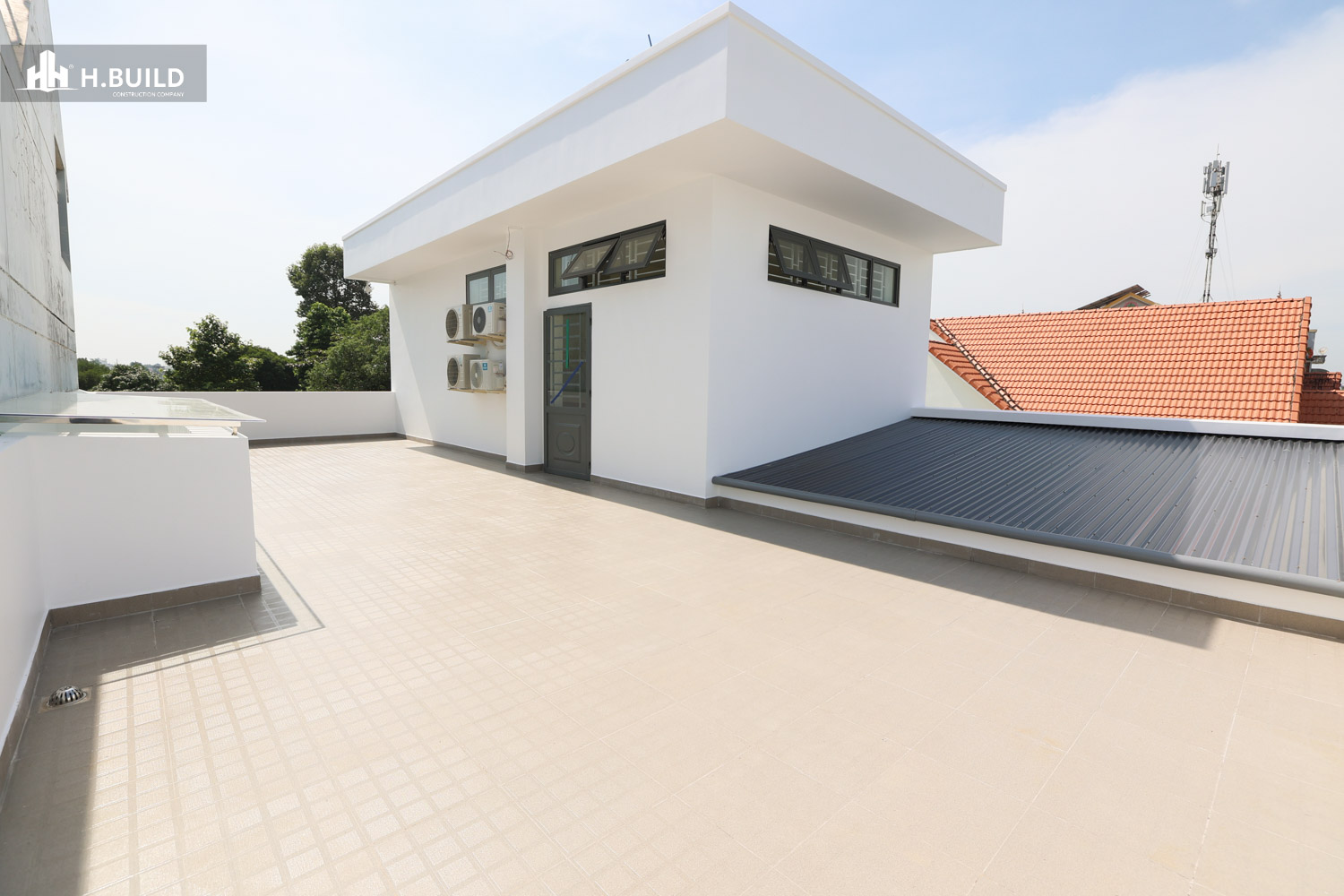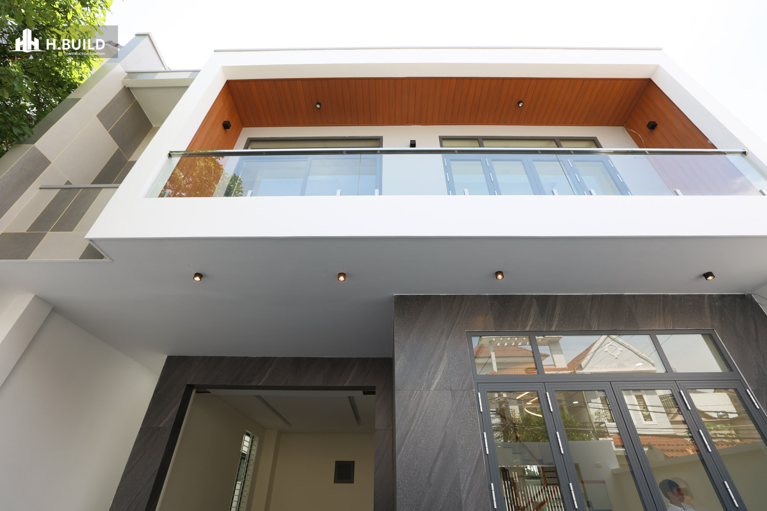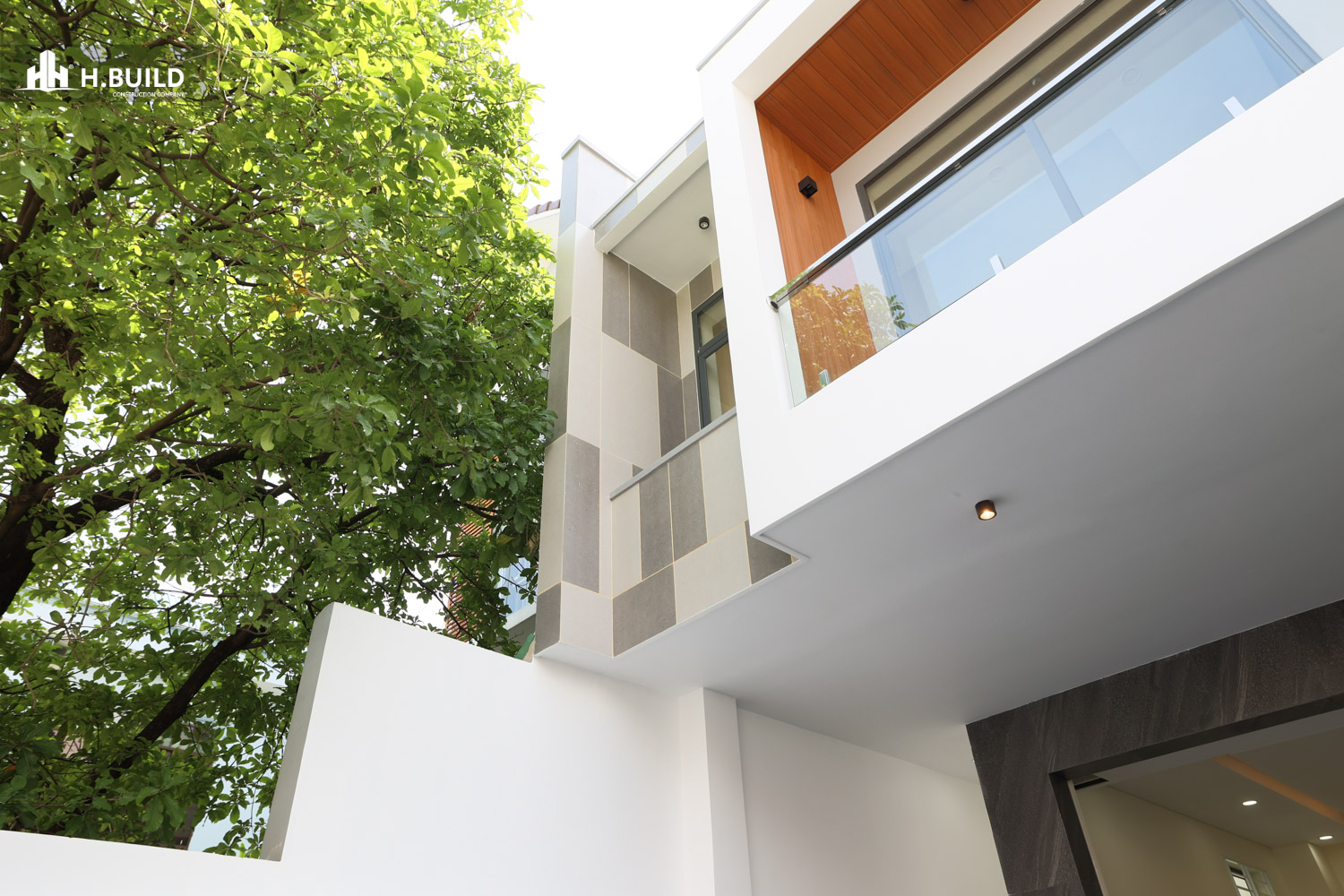 Mặt tiền được tổ chức thành nhiều lớp không gian có chiều sâu, với điểm nhấn là khối ban công tầng hai được bao bọc bởi một khung trắng lớn vươn ra ngoài, vừa tạo điểm nhấn thị giác vừa che nắng cho không gian bên dưới.