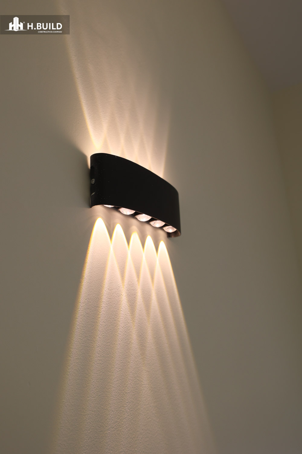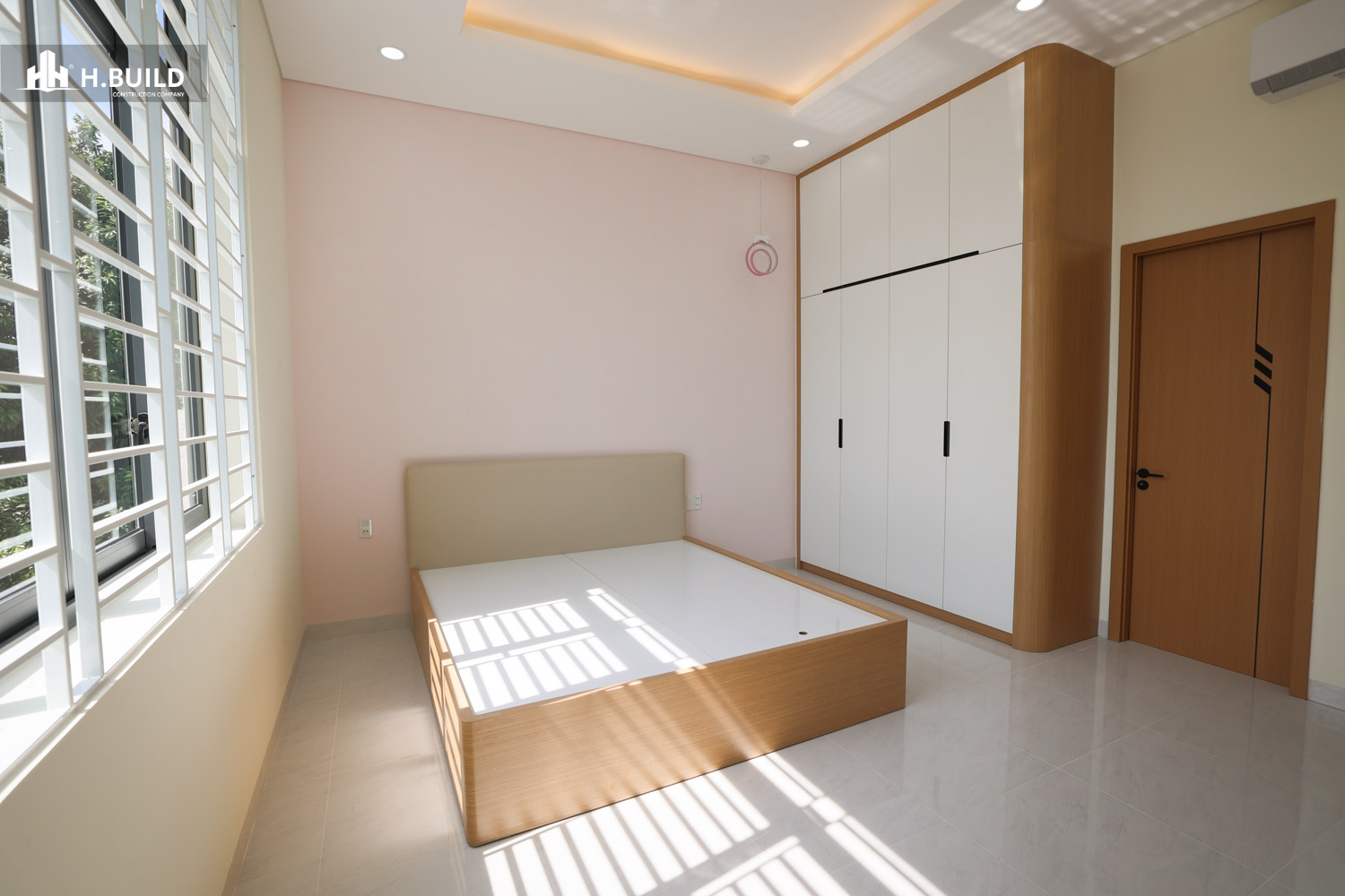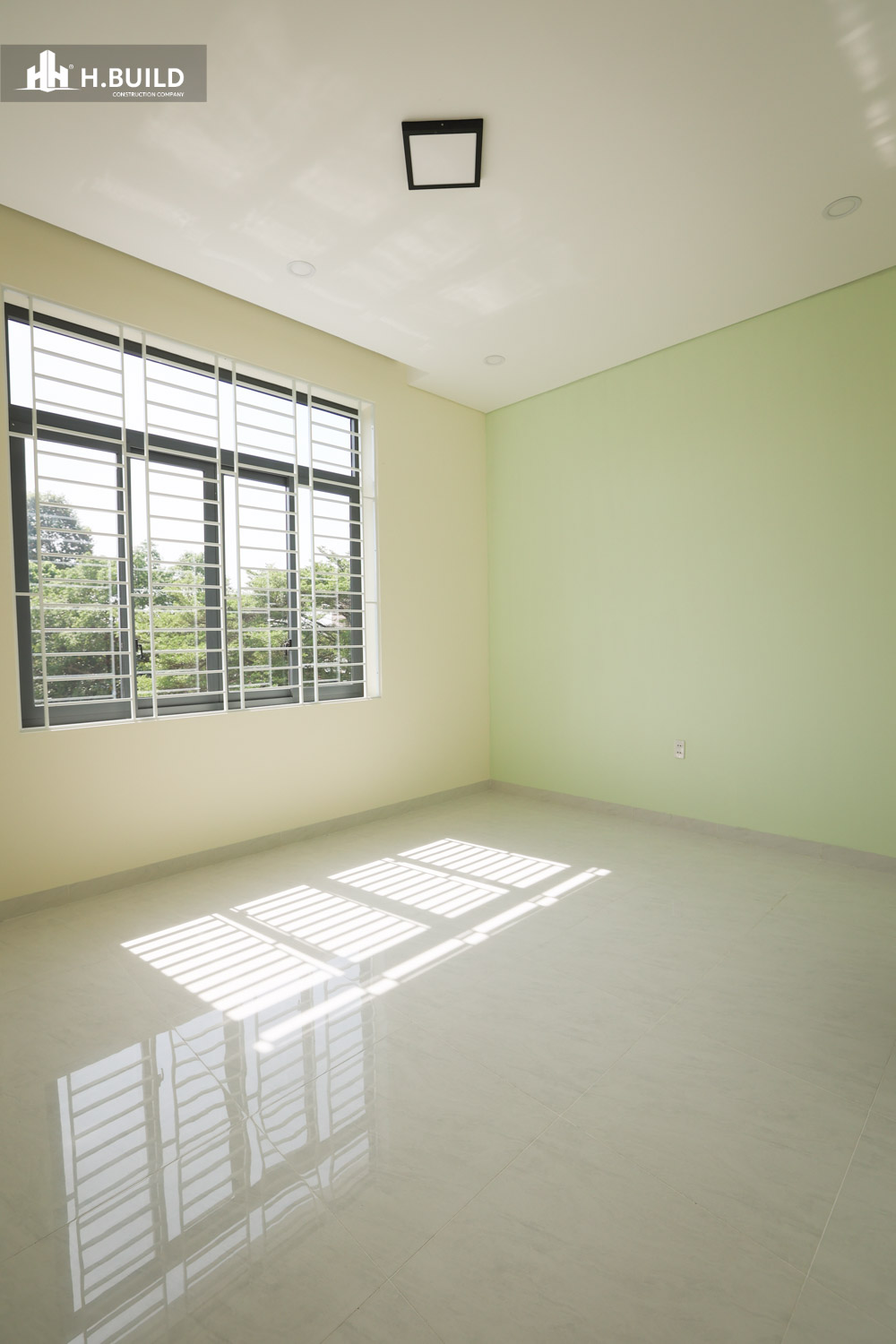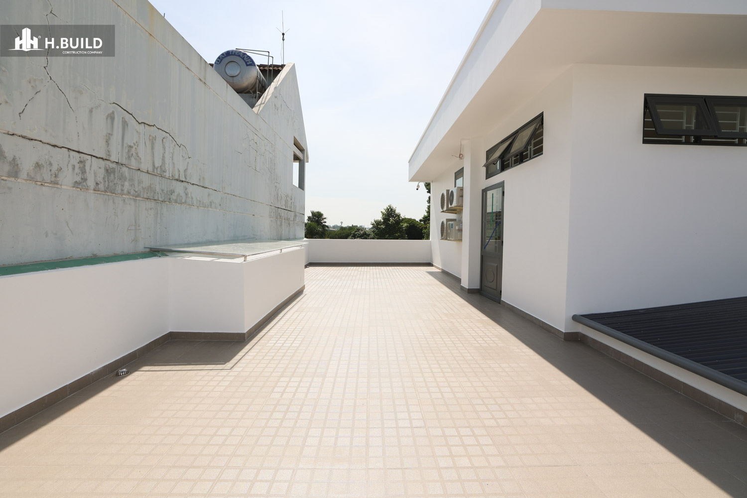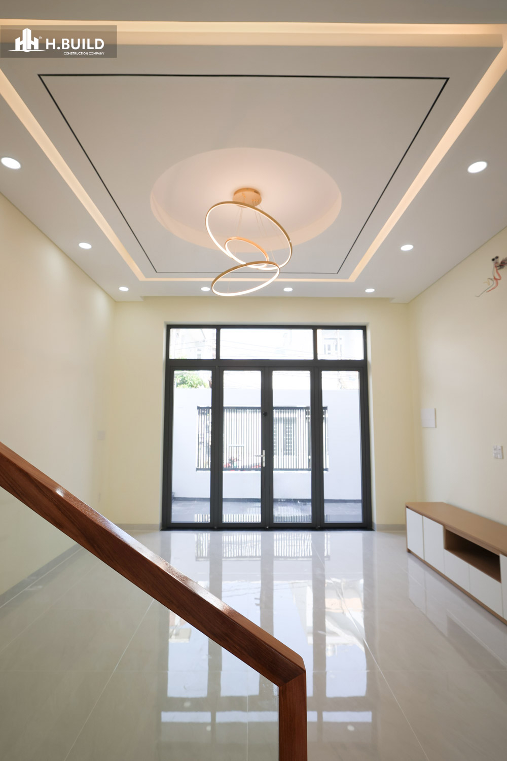 Mặt tiền được tổ chức thành nhiều lớp không gian có chiều sâu, với điểm nhấn là khối ban công tầng hai được bao bọc bởi một khung trắng lớn vươn ra ngoài, vừa tạo điểm nhấn thị giác vừa che nắng cho không gian bên dưới.