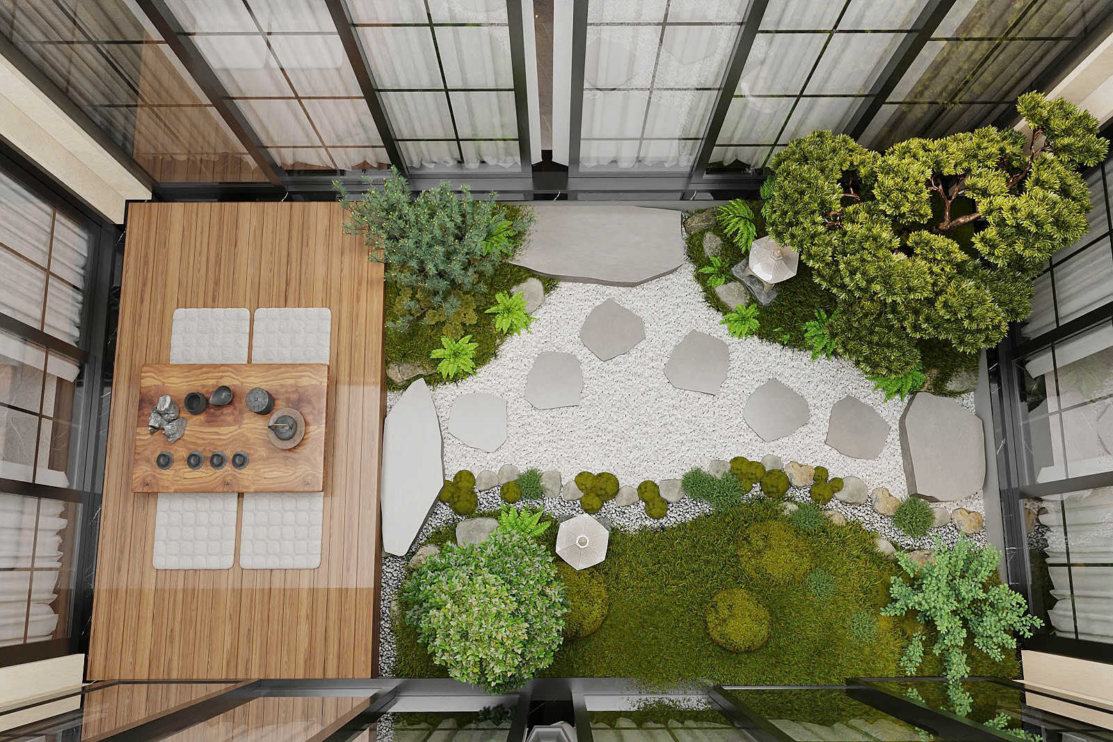 Trái tim của dinh thự là khối nhà chữ U tráng lệ, ôm trọn một khoảng sân trong yên tĩnh, nơi kết nối mọi không gian và chan hòa ánh sáng tự nhiên.