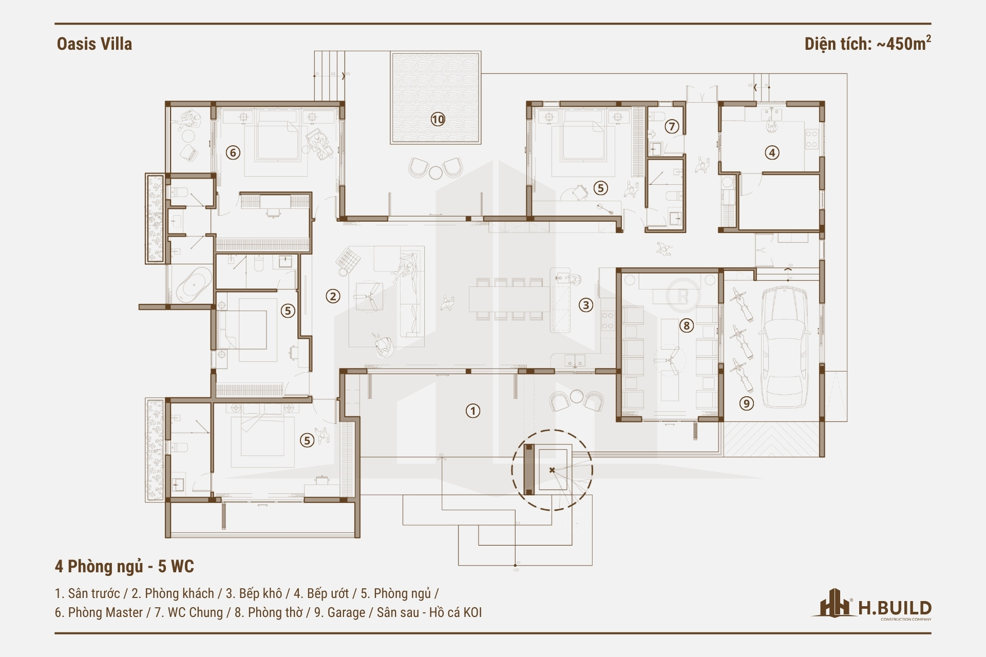 Sự đắt giá của thiết kế nằm ở “trái tim” là hồ cá Koi trung tâm, vừa điều hòa vi khí hậu vừa là điểm kết nối thị giác cho toàn bộ không gian.