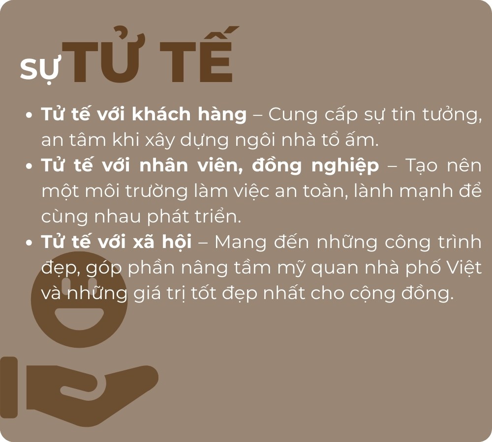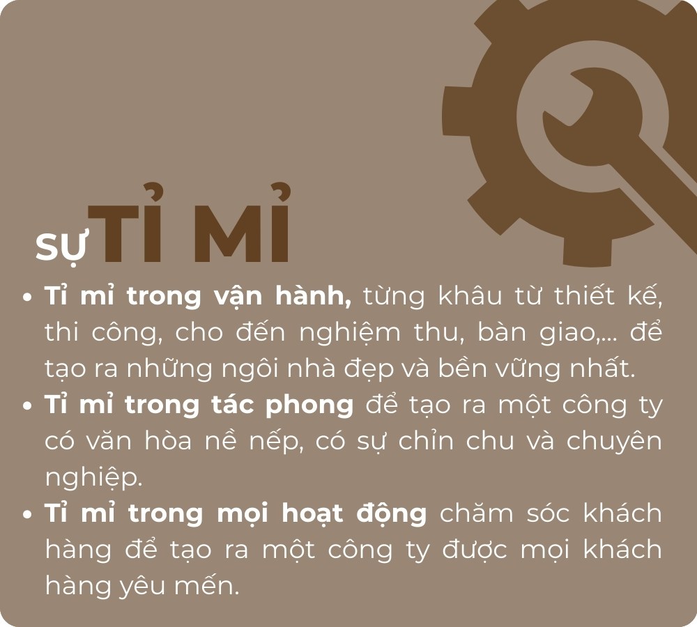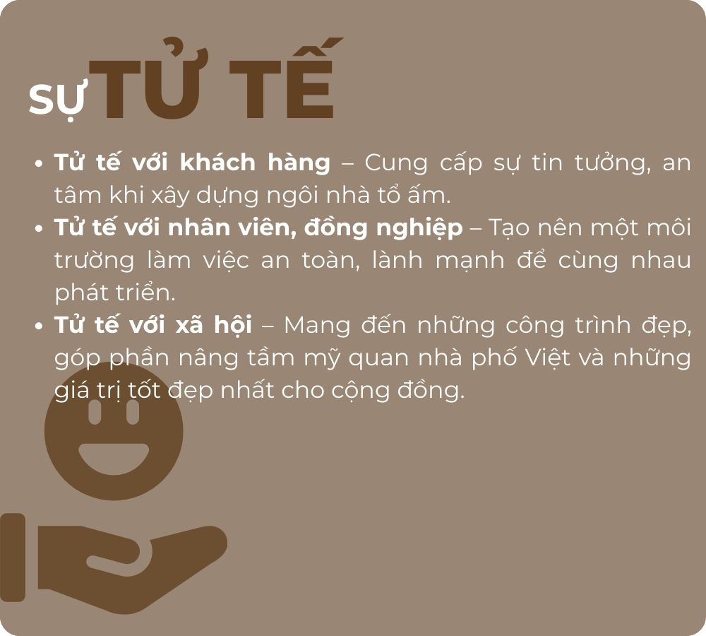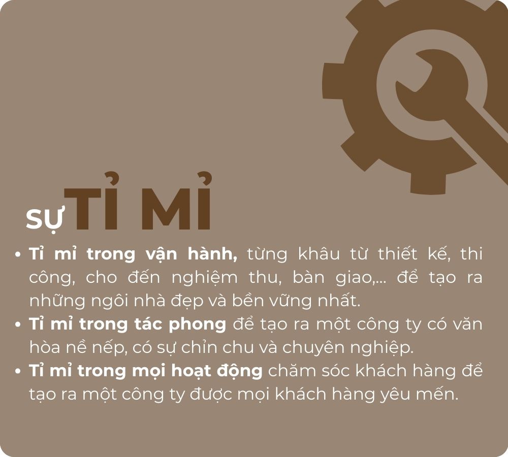 Lựa chọn hướng đi “Chuyên sâu nhà ở dân dụng” – Năm 2030, trở thành một trong những công ty xây dựng & nội thất hàng đầu được khách hàng tin tưởng lựa chọn trong phân khúc xây dựng nhà ở tại Việt Nam. Có chất lượng công trình vượt trội, quy trình làm việc chuyên nghiệp và khả năng quản lý hiệu quả nhiều dự án đồng thời, hướng đến sự hài lòng cao nhất của khách hàng.